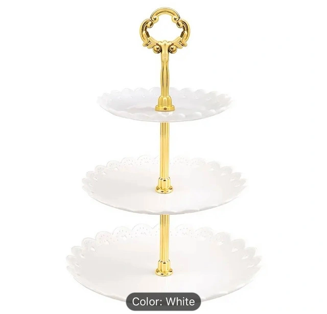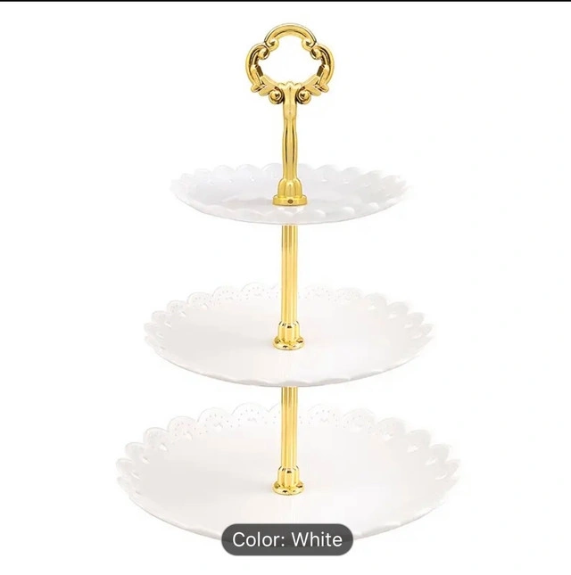 88Elegant three-tiered serving stand. White plates with scalloped edges. Gold-coloured metal stand and handle. Perfect for parties or afternoon tea. Elegant 3-Tier Cupcake Stand with Ruffled or Lace Design - Ideal for Afternoon Tea, Weddings & Parties - Durable Plastic Dessert Serving Tray