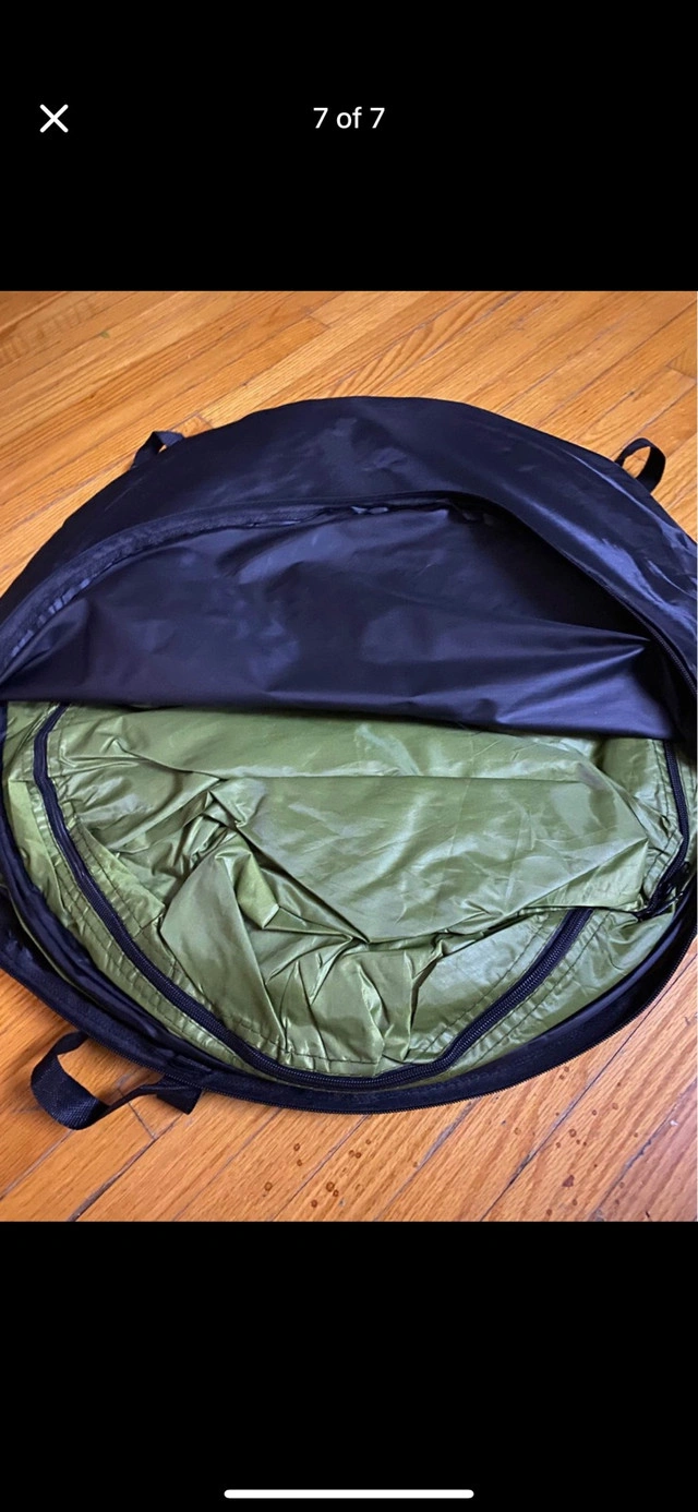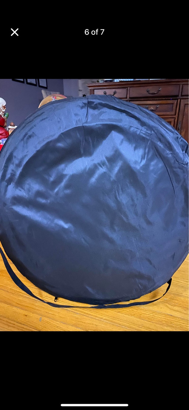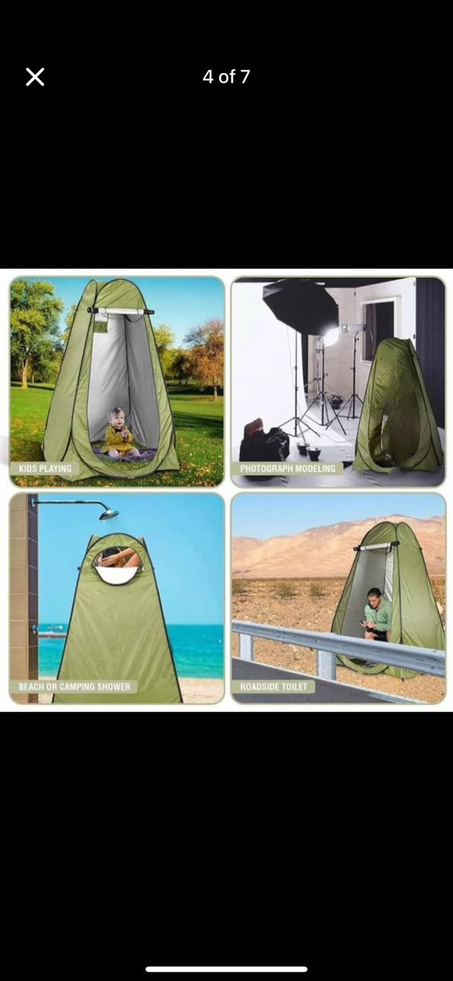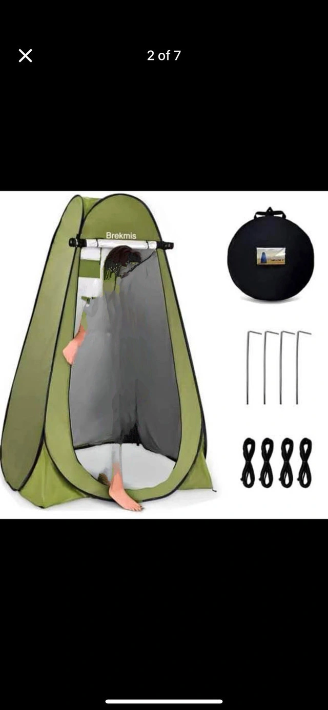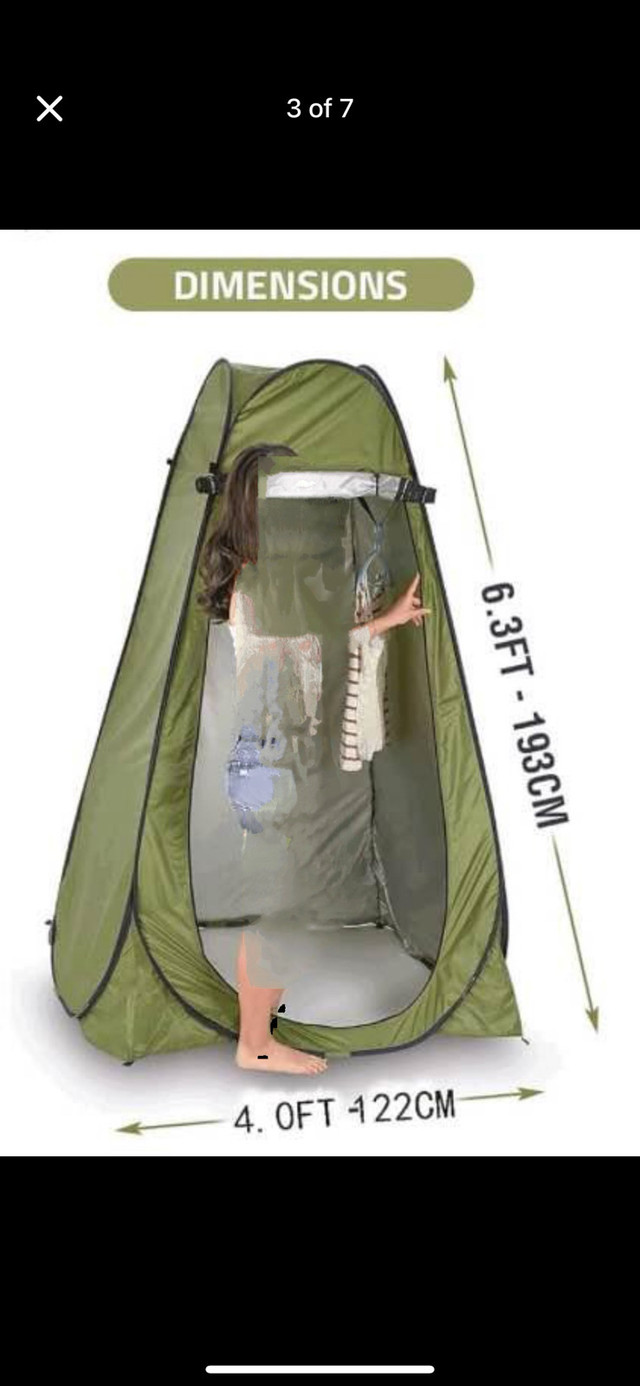 Pop-up privacy tent. Great for camping, showering, changing clothes, or other uses. Includes carrying case and stakes. Easy setup. Approximately 6.3ft tall and 4ft wide.
