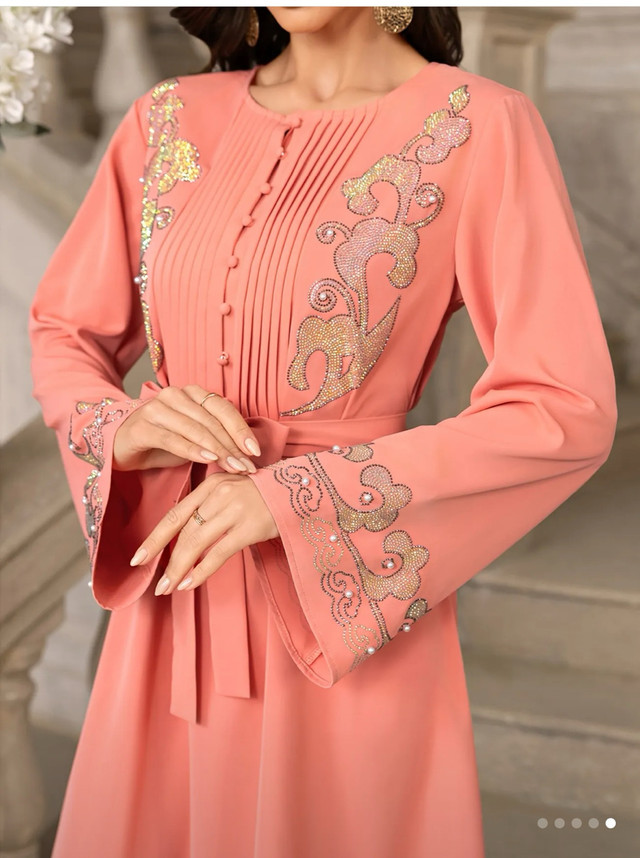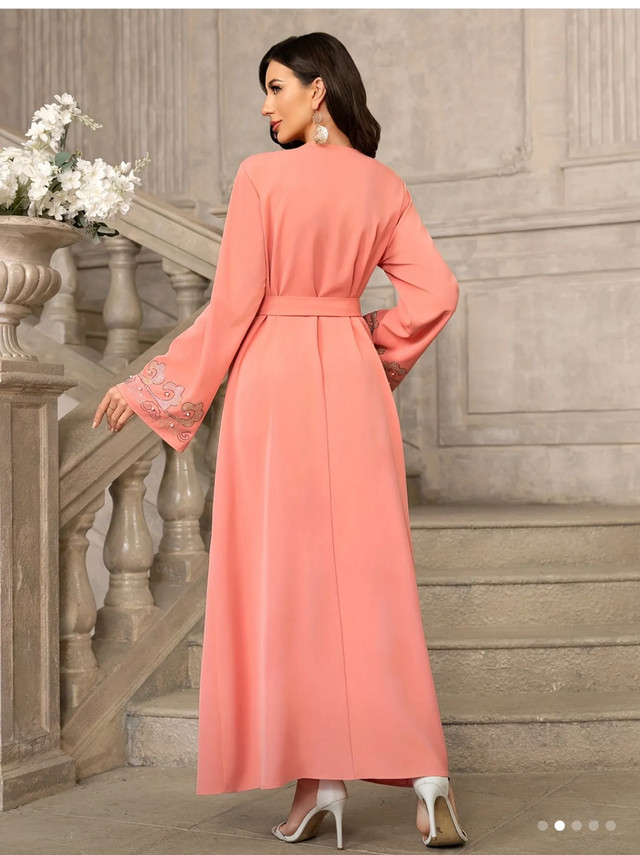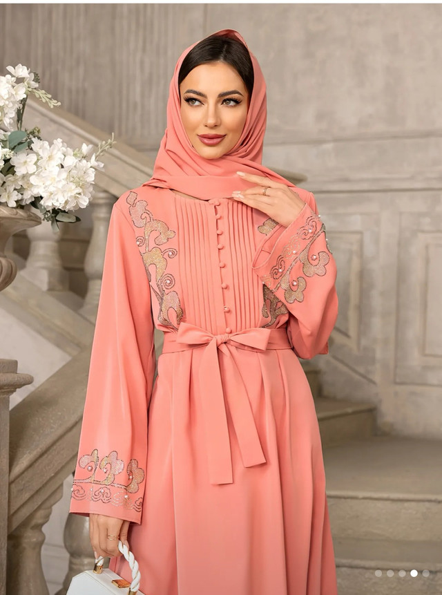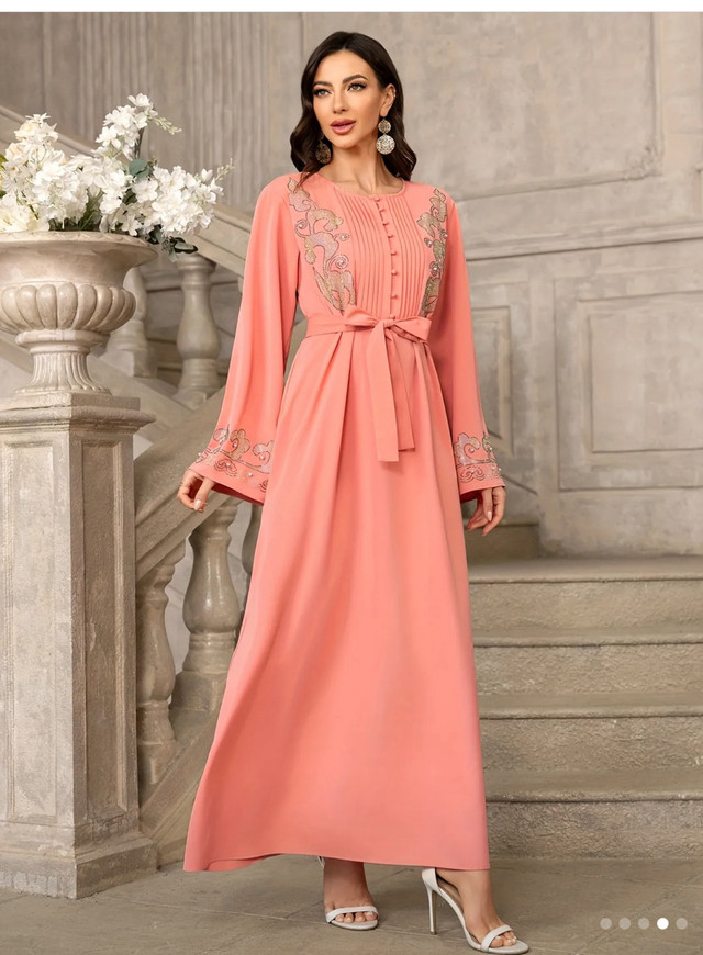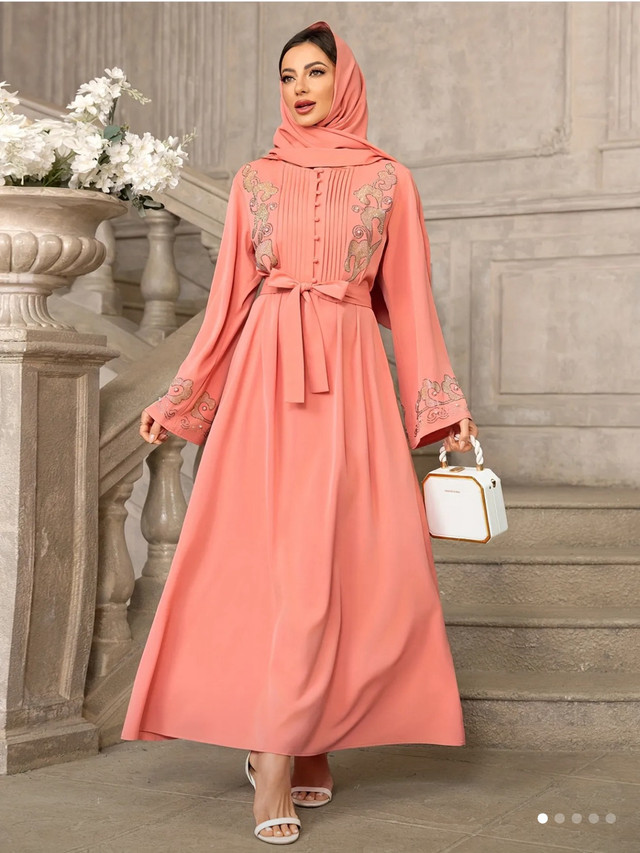 Elegant Women's Long Sleeve Maxi Dress with Floral Details, Hijab Scarf & Belt - Pink Polyester Traditional Attire for Spring/Summer/Fall