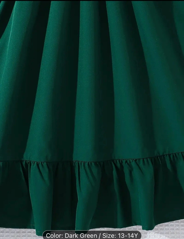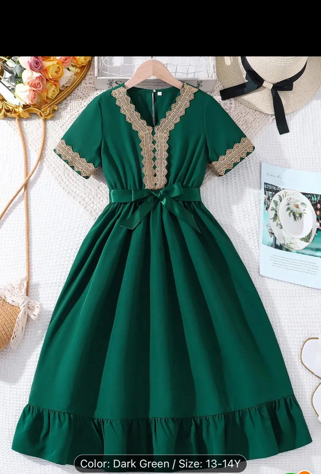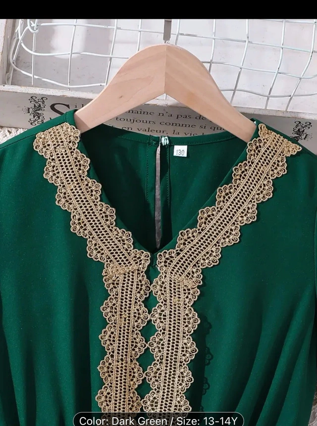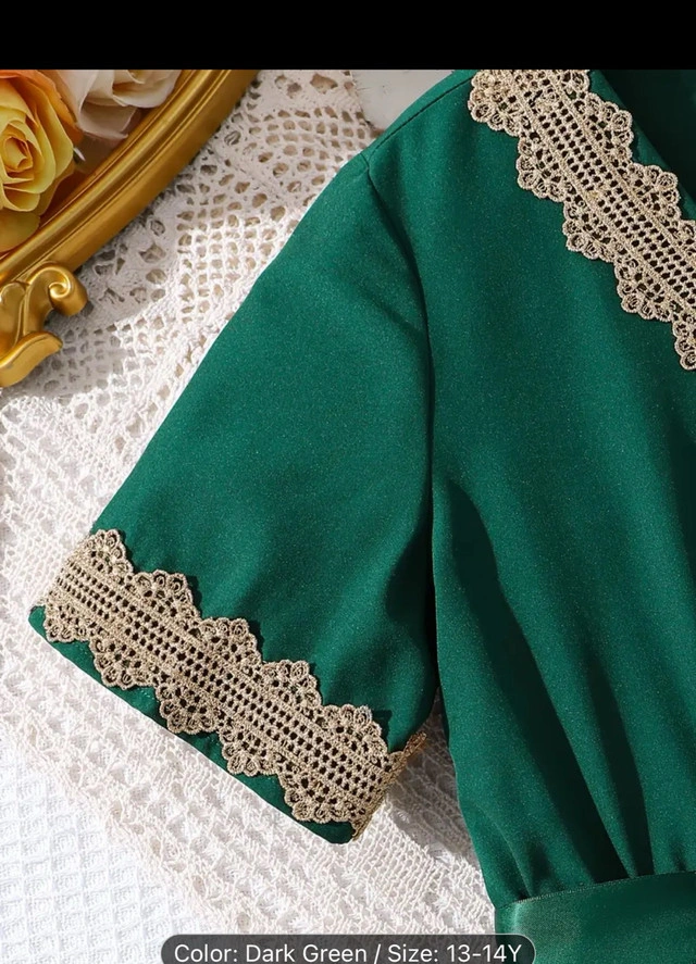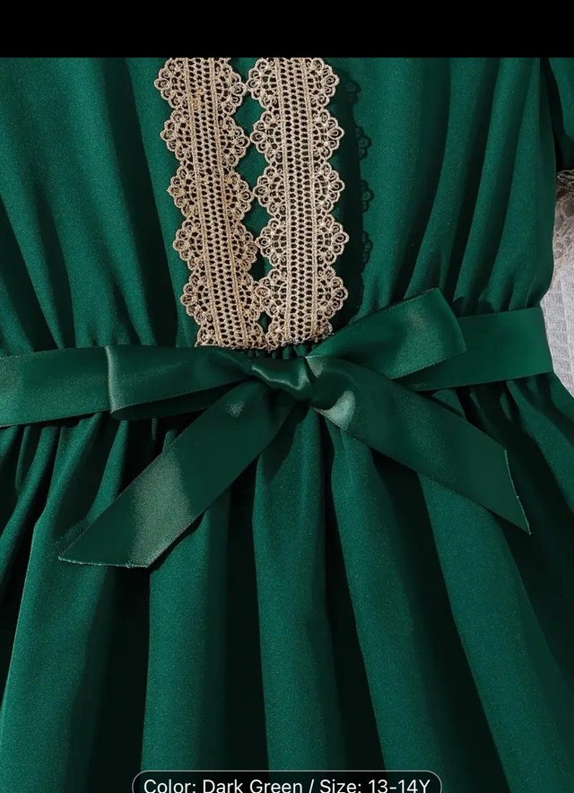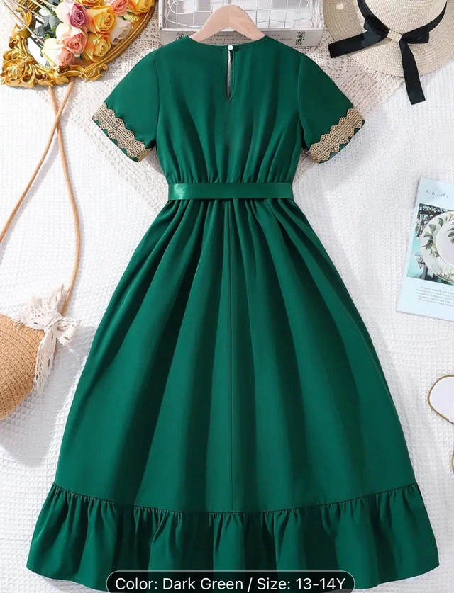 88Dark green midi dress with gold lace detailing at the neckline and sleeves. It has an A-line silhouette, short sleeves and a ruffle hem. Comes with a matching green waist tie.