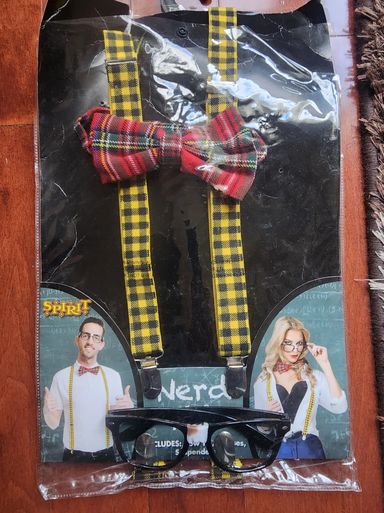 86Get ready to transform with this fun Nerd costume set from Spirit! Includes a red plaid bowtie, yellow plaid suspenders, and black glasses. Perfect for a costume party or just for fun!
