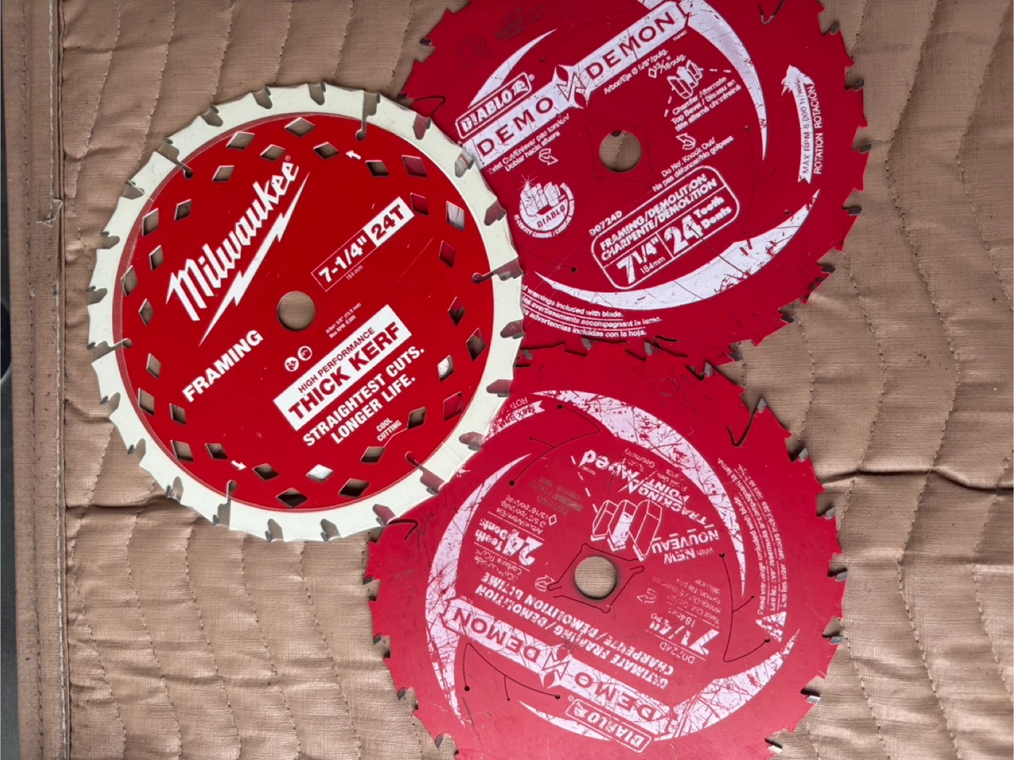 9Selling a set of 7-1/4 inch saw blades! Includes a Milwaukee Framing blade and two Diablo Demo Demon blades. Perfect for your next project!