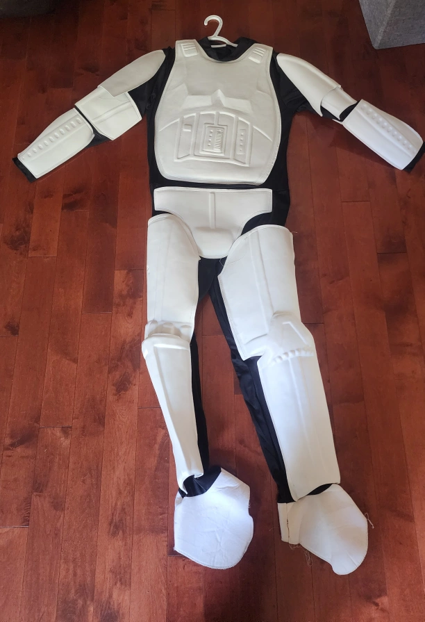 86Selling a Star Wars Stormtrooper costume. It appears to be in good condition and includes the full body armour set and black undersuit. Great for Halloween! it does not have a size but my kid was in his teenage years