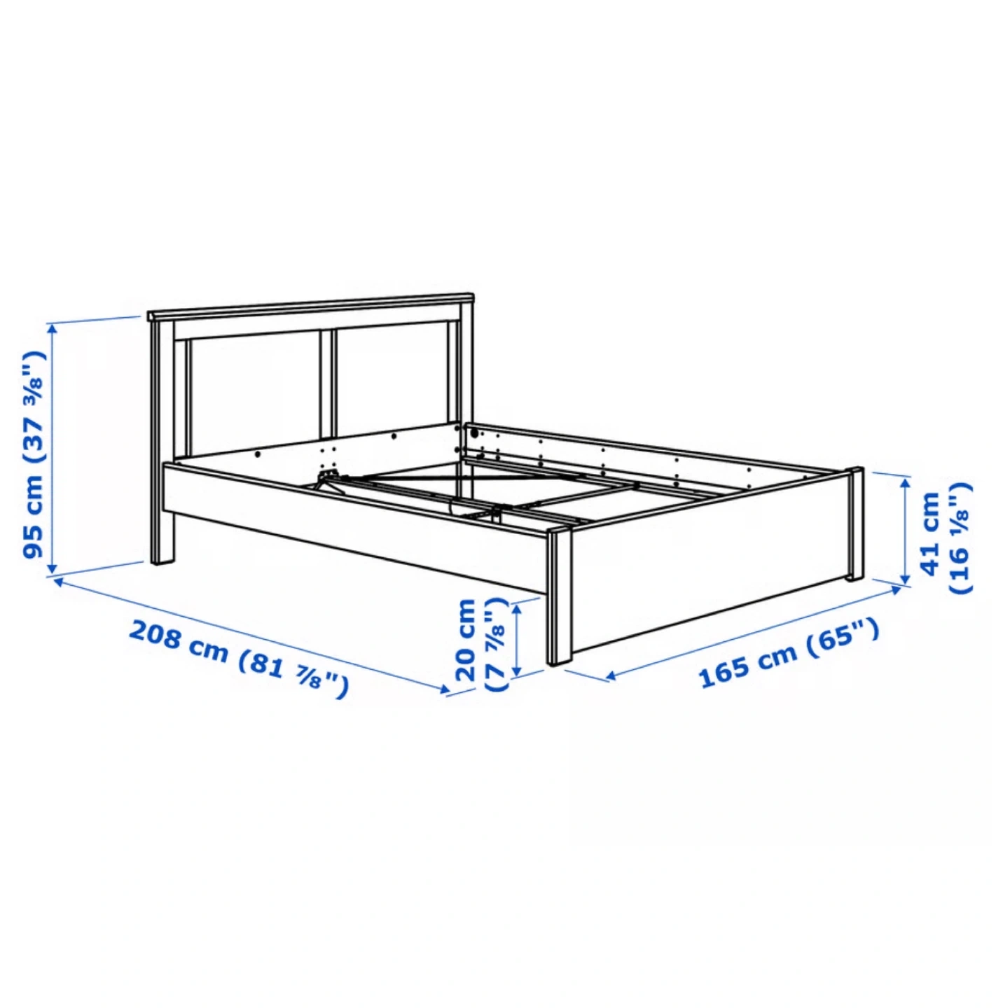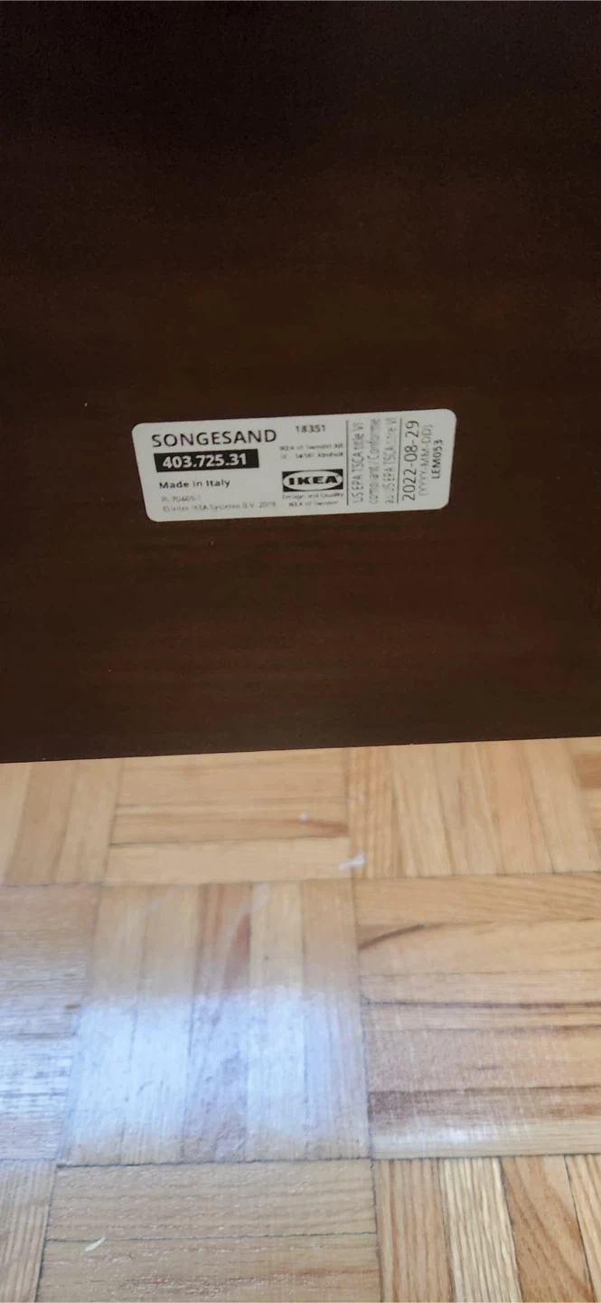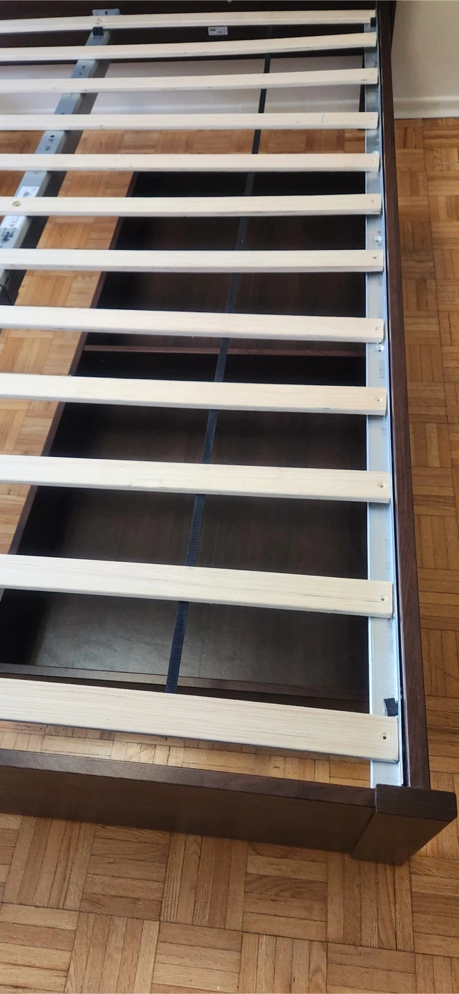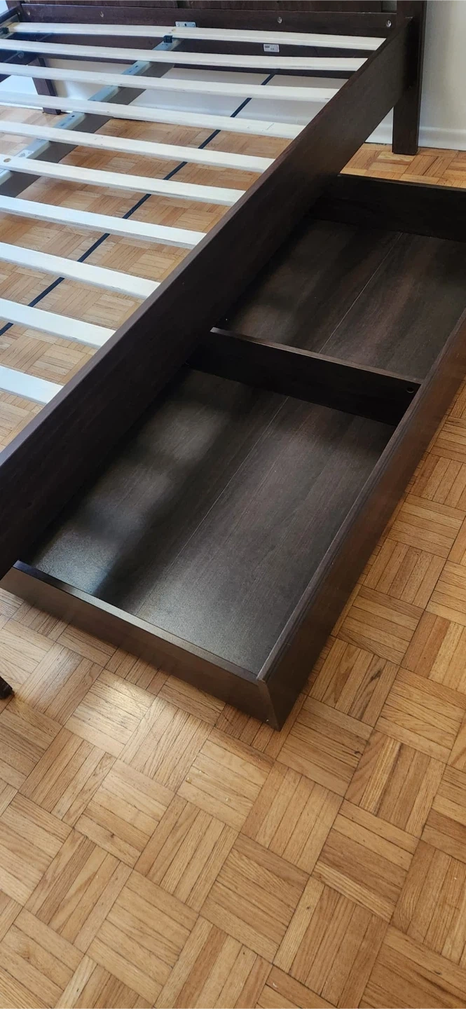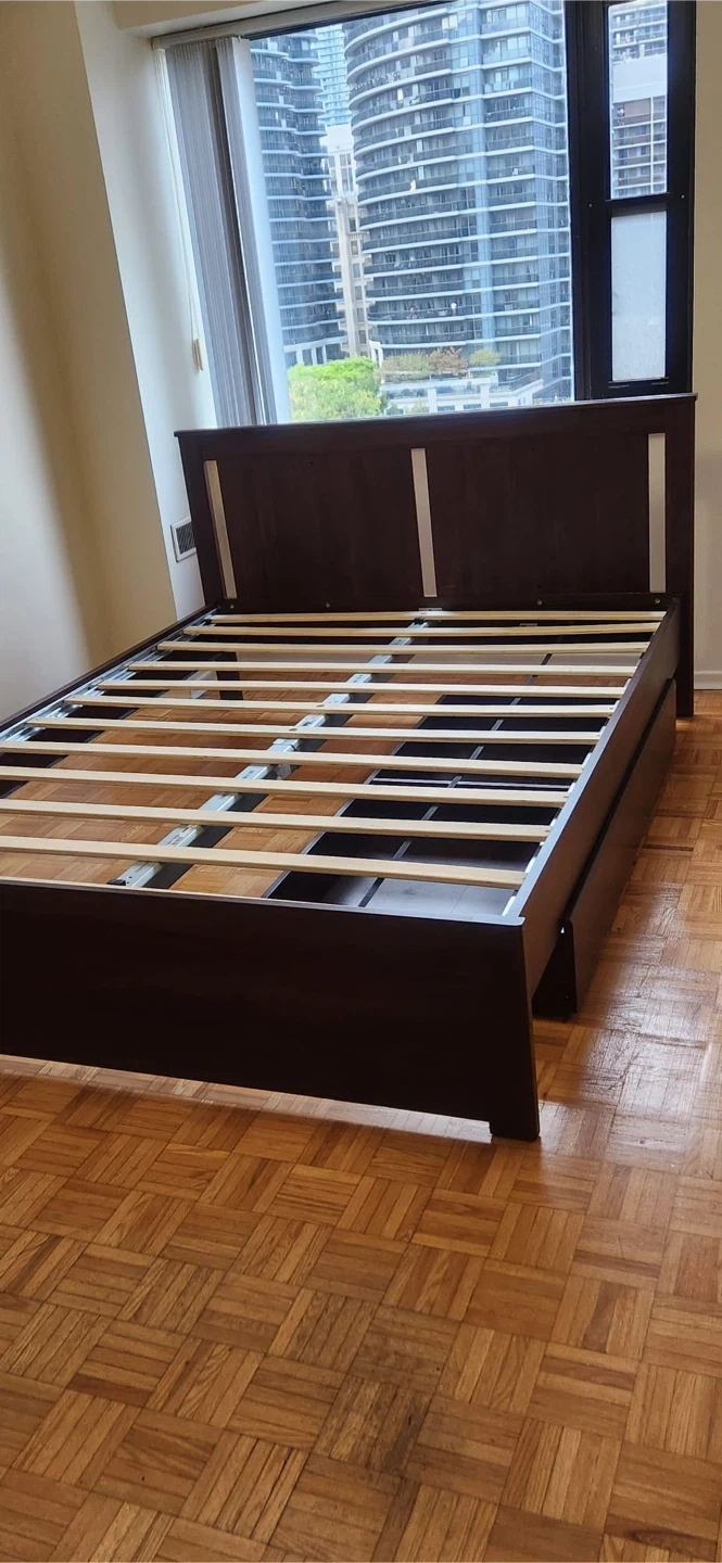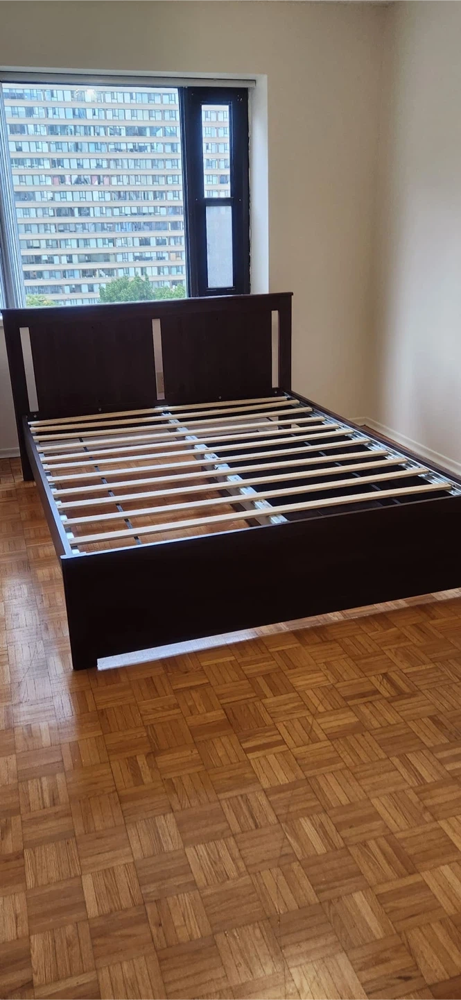 346PICK UP ONLY. Selling a queen-size IKEA Songesand bed frame in brown (slat included). It's in great condition and measures approximately 81 7/8" in length and 65" in width. The headboard height is about 37 3/8". Perfect for adding a touch of classic style to your bedroom!