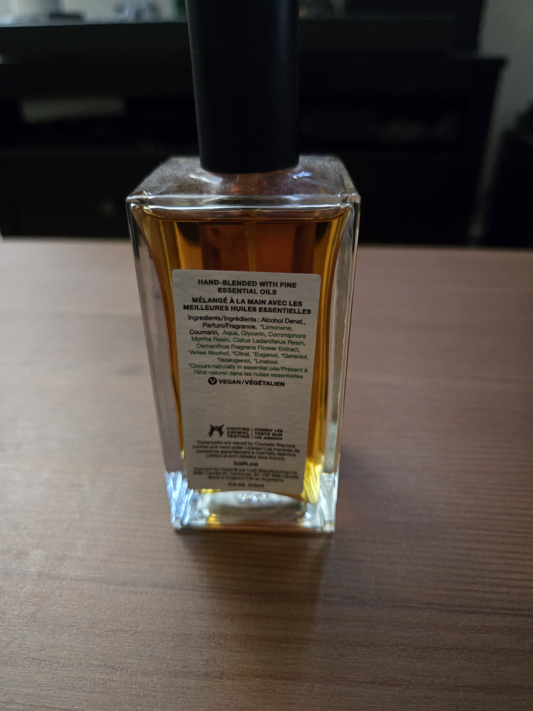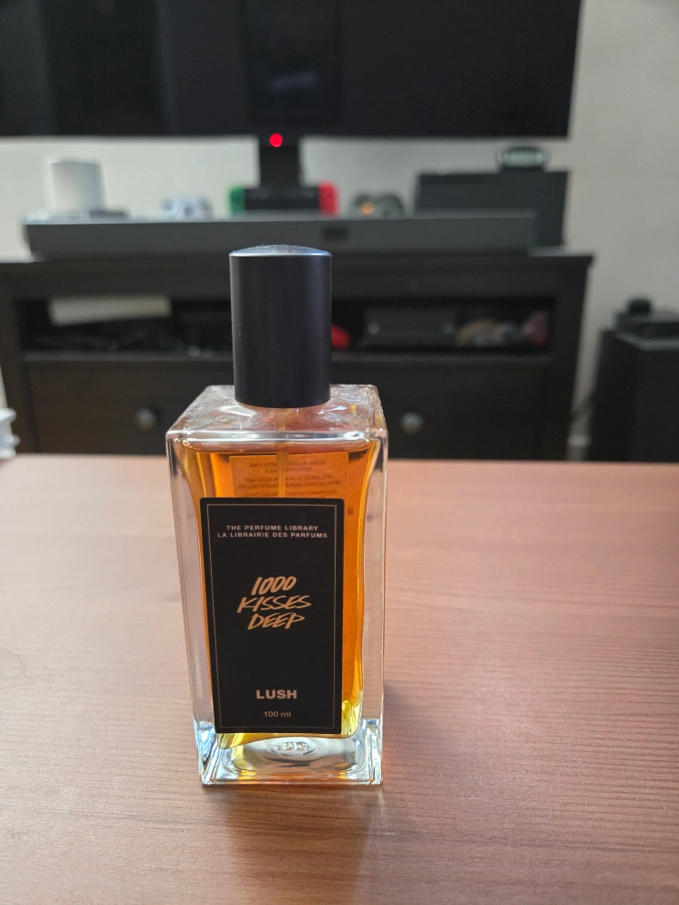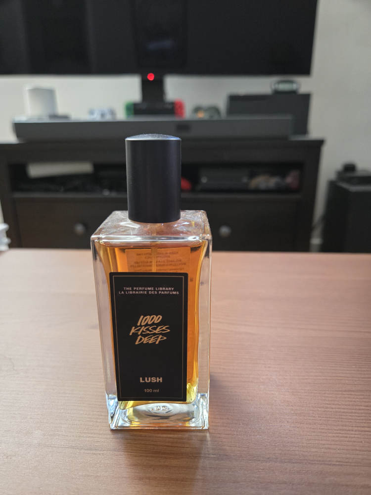 Selling a bottle of Lush's 1000 Kisses Deep perfume. It's a hand-blended perfume with fine essential oils. The bottle contains 100 ml of product.