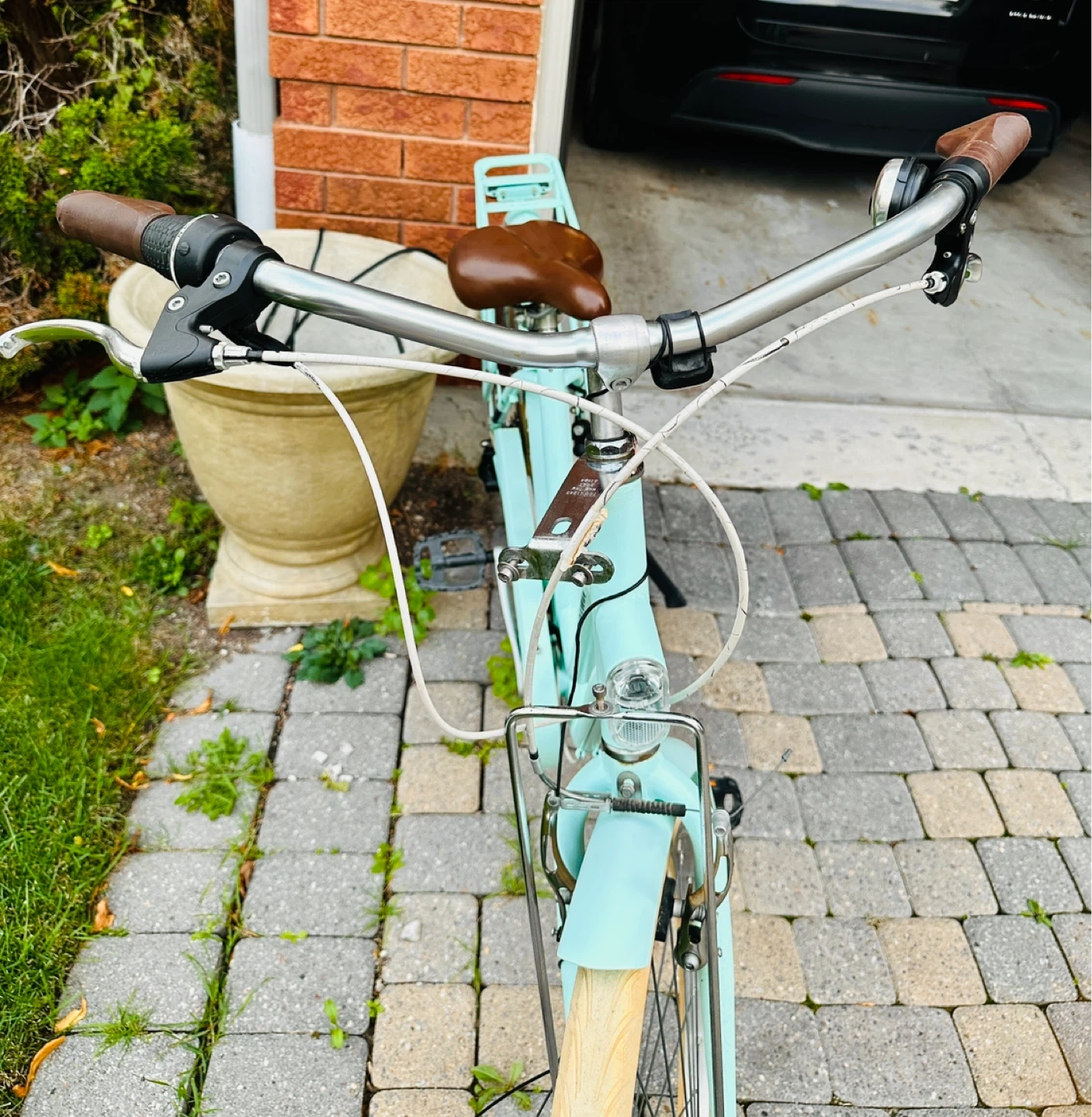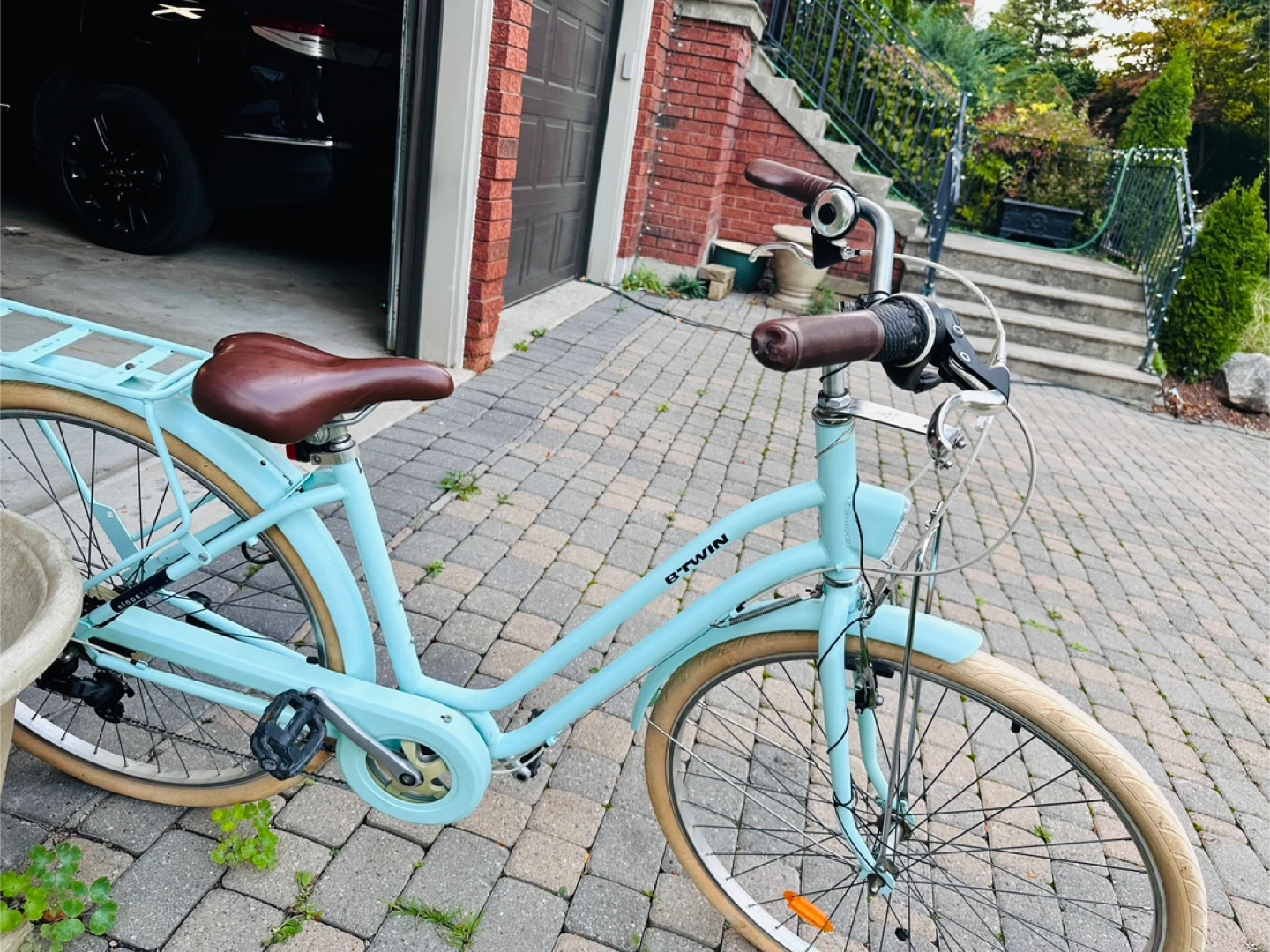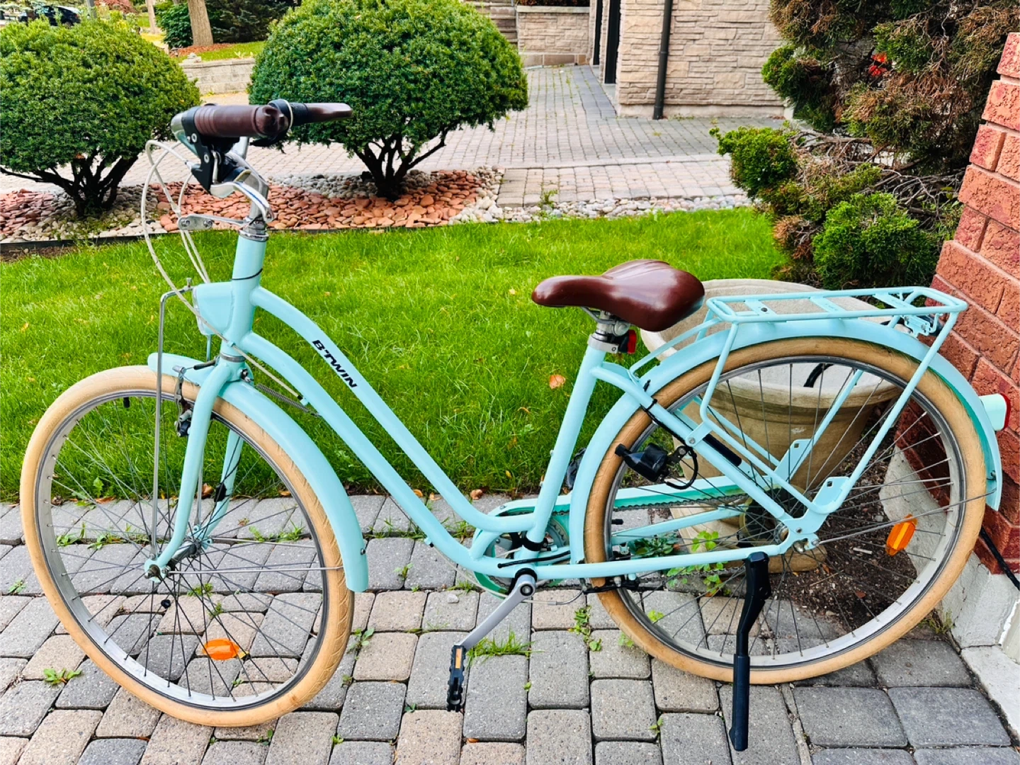 Selling a Decathlon BTWIN city bike in a lovely mint green colour! It's perfect for leisurely rides around town or commuting. The bike is in great condition and ready for a new owner to enjoy. It has a bell which works. It also has bike reflectors which make it safe for riding at night. It has a comfortable brown seat and handy rack on the back. Feel free to message me with any questions!