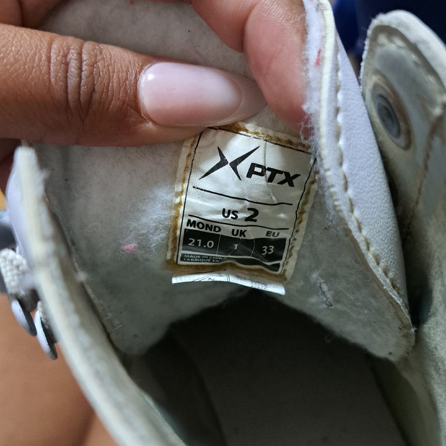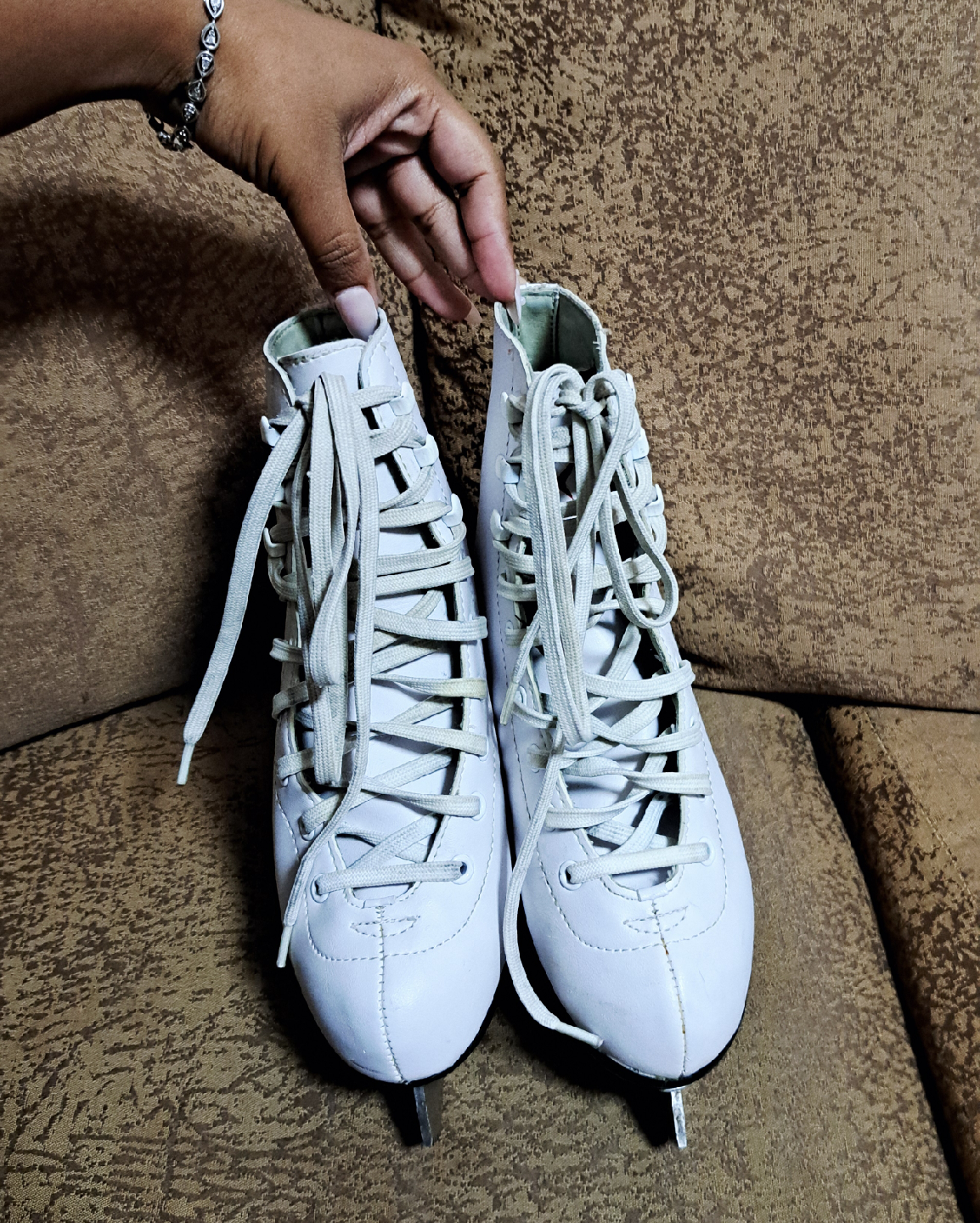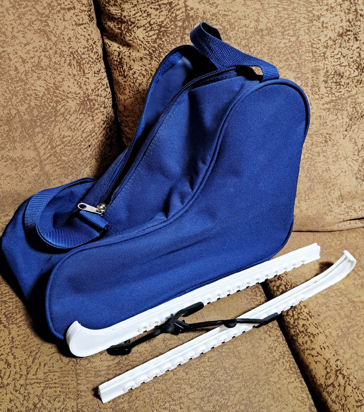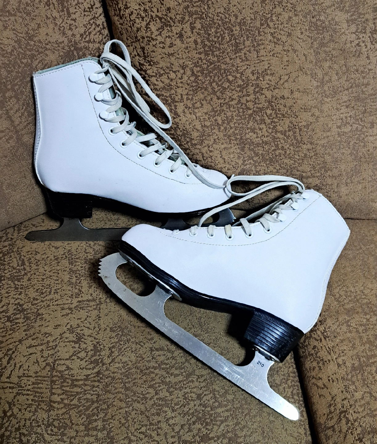 Selling a pair of white ice skates. They come with a blue carrying bag, blade wiping cloth and blade guards. Great for recreational skating!