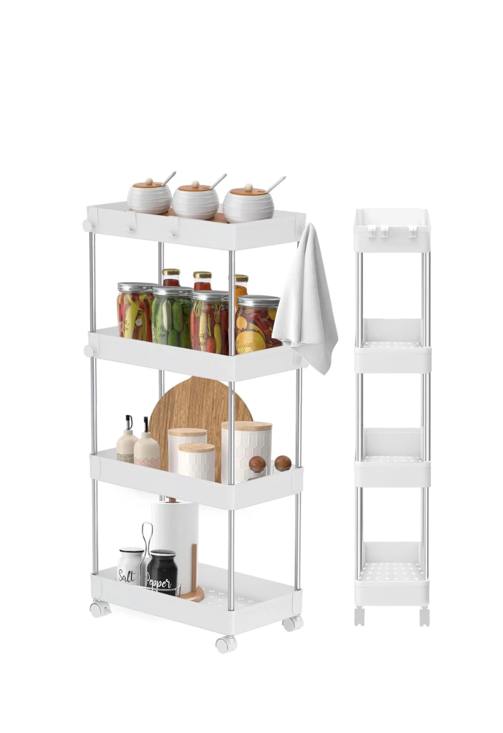 I'm selling a white rolling storage cart. It appears to have multiple tiers, perfect for organizing various items. It comes with wheels for easy mobility