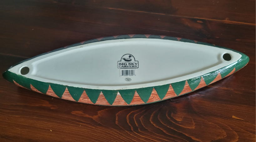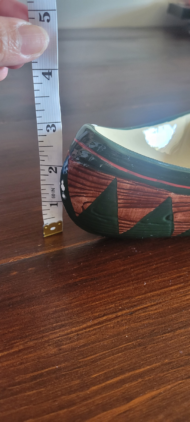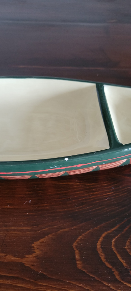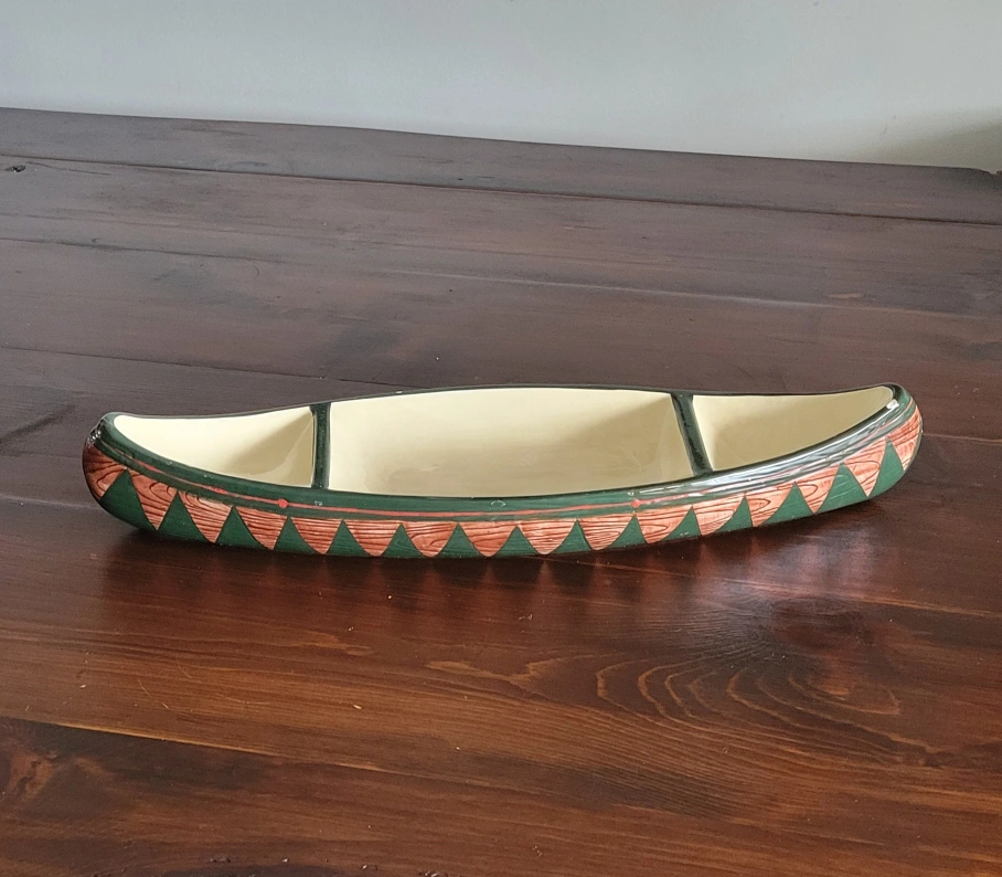 Selling a unique, vintage ceramic canoe-shaped serving dish! It features a green rim with a wood-grain pattern and a triangular design on the sides.