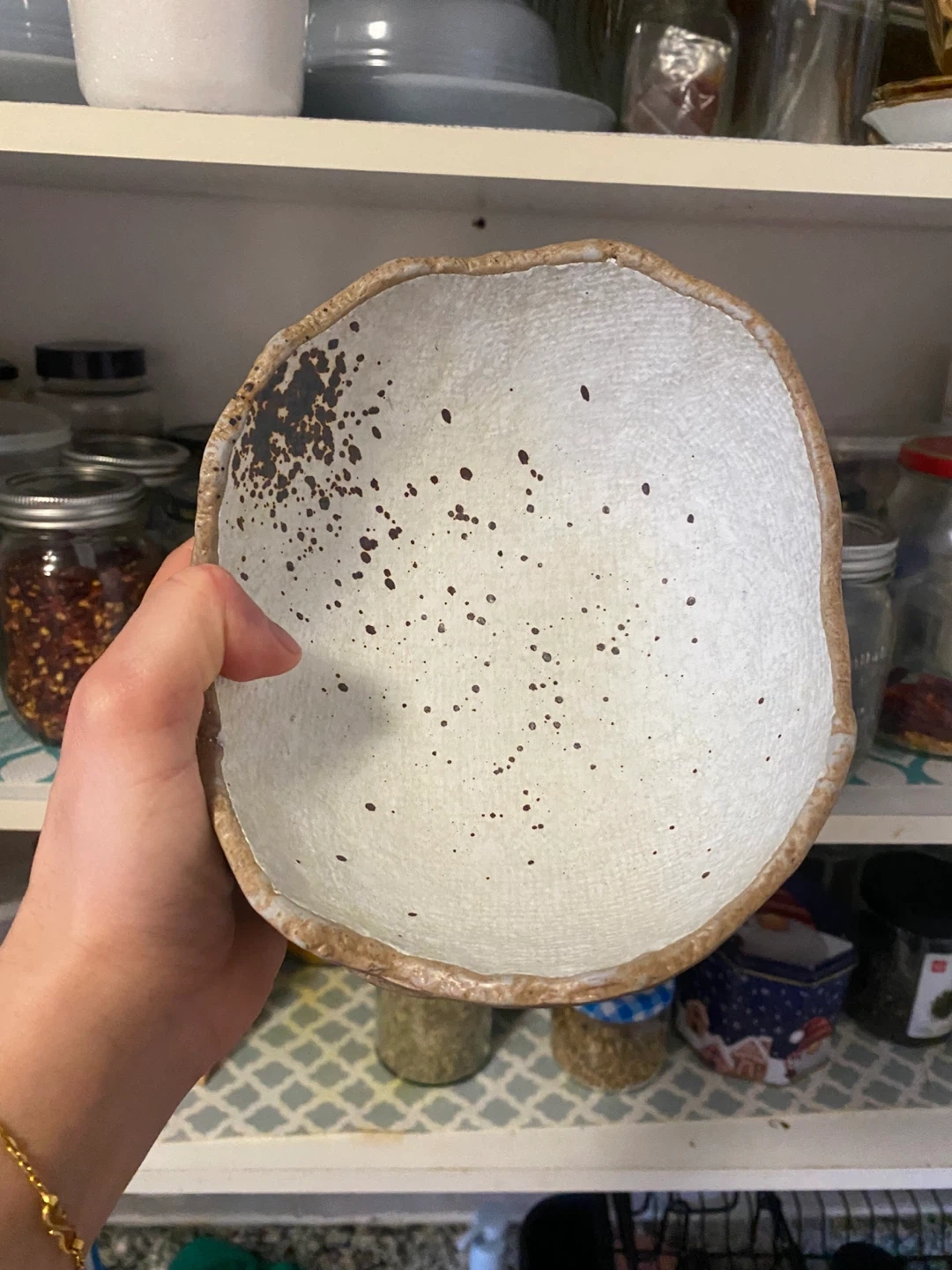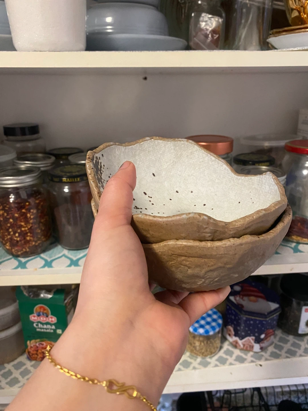 Selling a set of two handmade ceramic bowls. They have a unique, rustic design with an off-white interior and speckled pattern. Perfect for adding a touch of artisanal charm to your kitchen or dining table!
