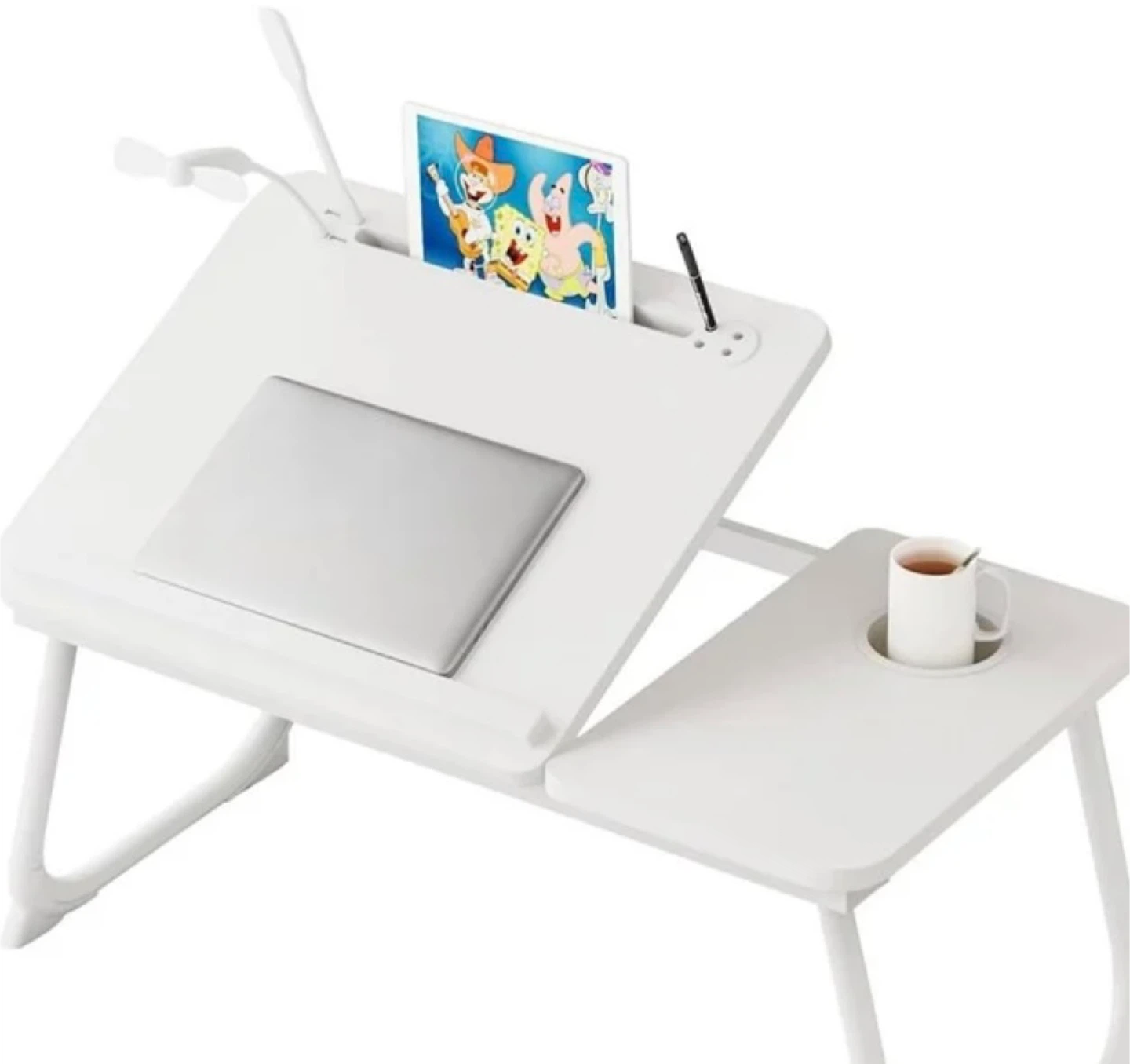 Selling a brand new adjustable laptop bed desk! It's perfect for working or relaxing in bed or on the couch. The desk is white and features an adjustable top for comfortable viewing angles. It also includes a cup holder and a slot for your tablet or phone. Lightweight and portable, it's great for small spaces