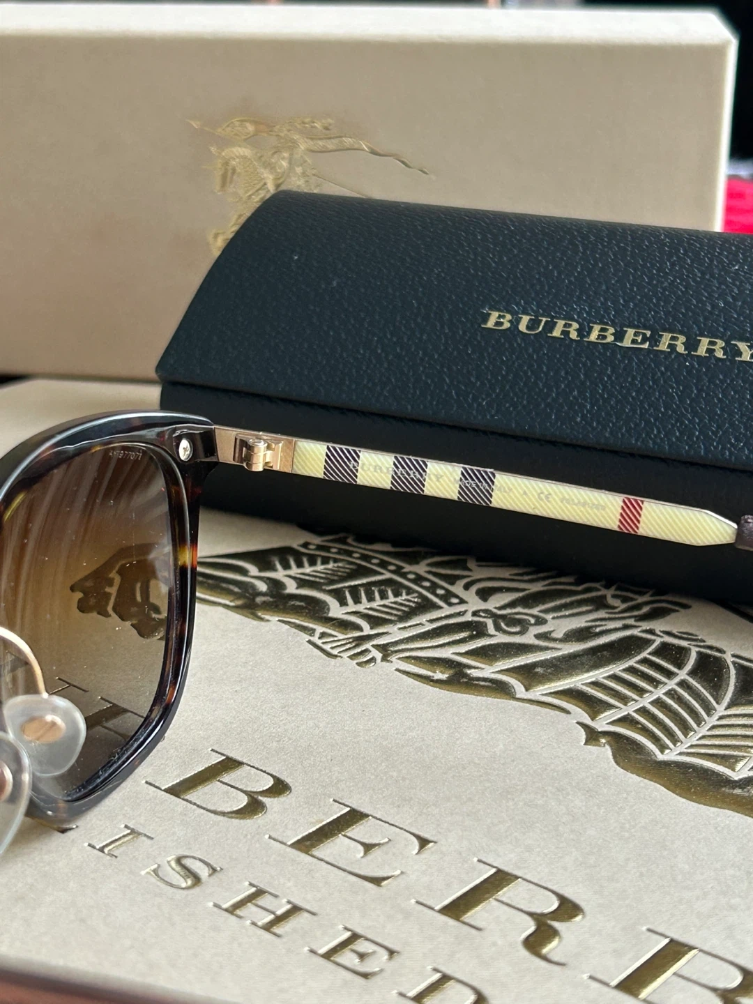 Authentic Burberry sunglasses, brown frame and lens, check interior, leather earpiece, brand new, with original case and box