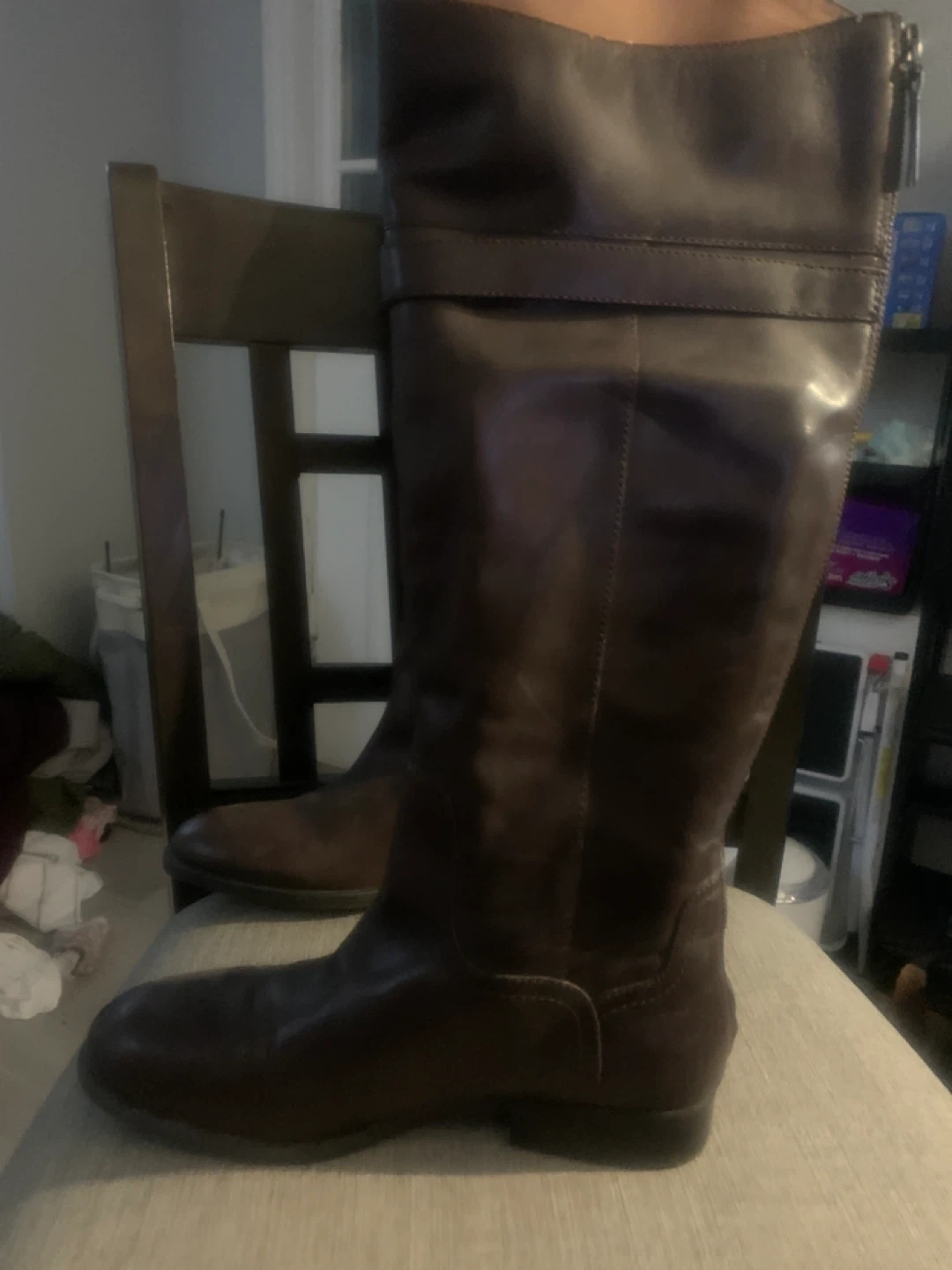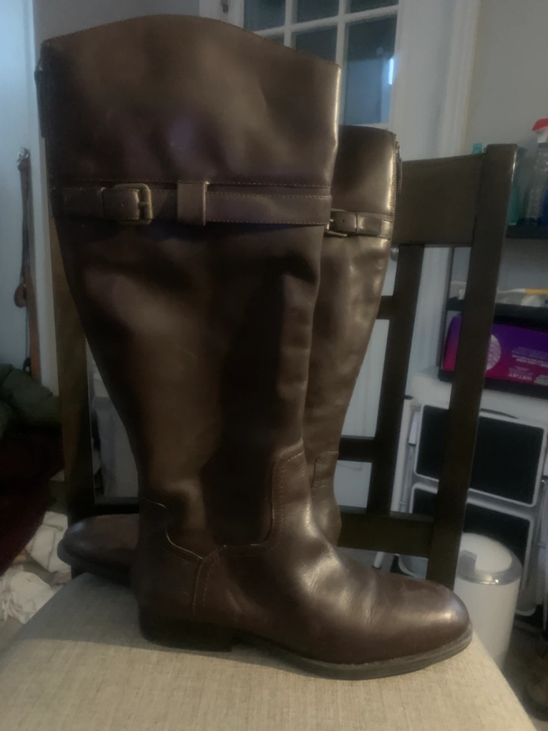 These gorgeous Nine West brown leather riding boots are in perfect condition. They are a size 8 and feature a buckle detail at the top. Perfect for fall and winter! Never worn! Paid $225 for them.