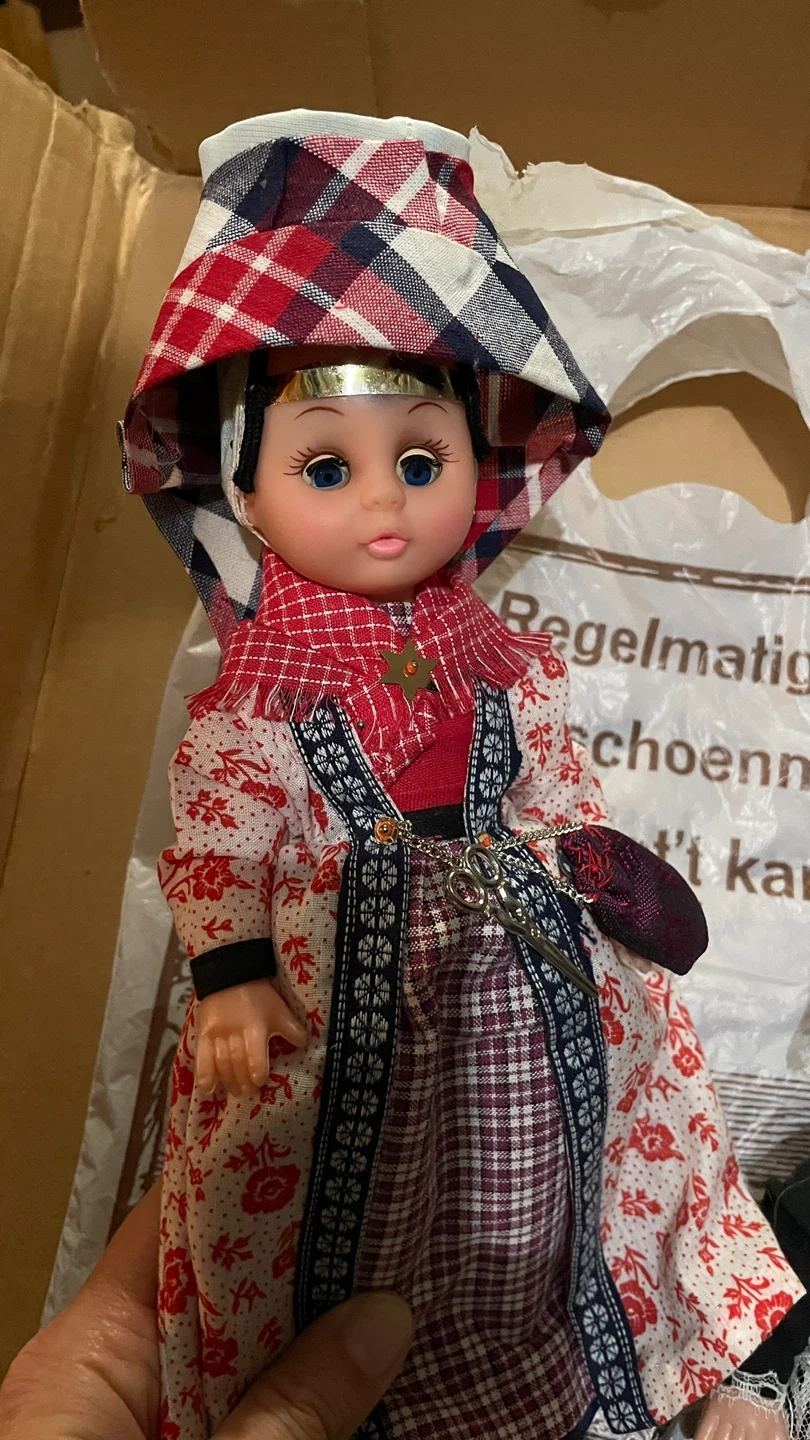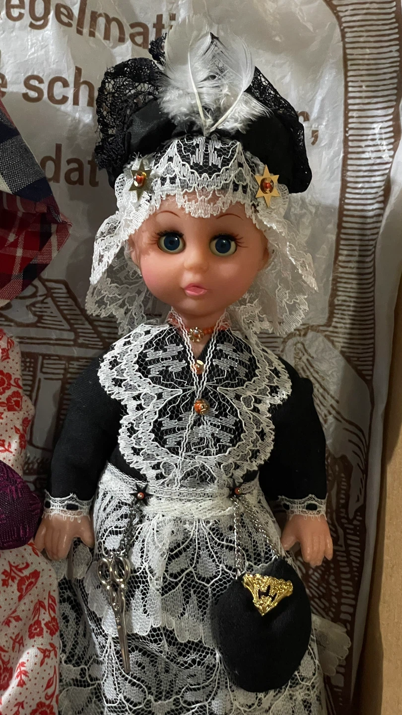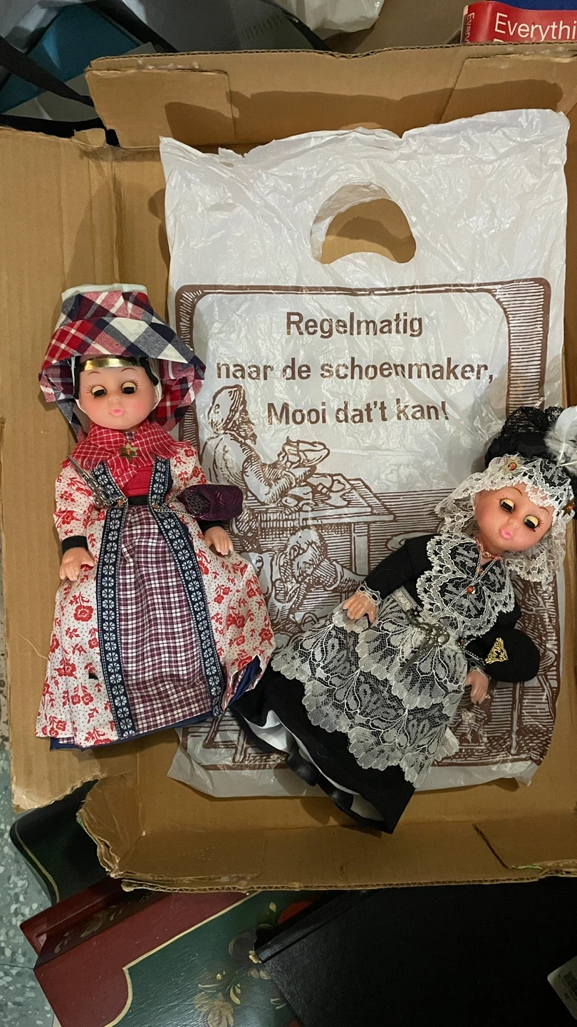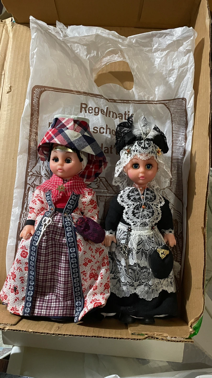Two adorable vintage Dutch dolls dressed in traditional clothing. They feature intricate details in their outfits. A charming addition to any doll collection!