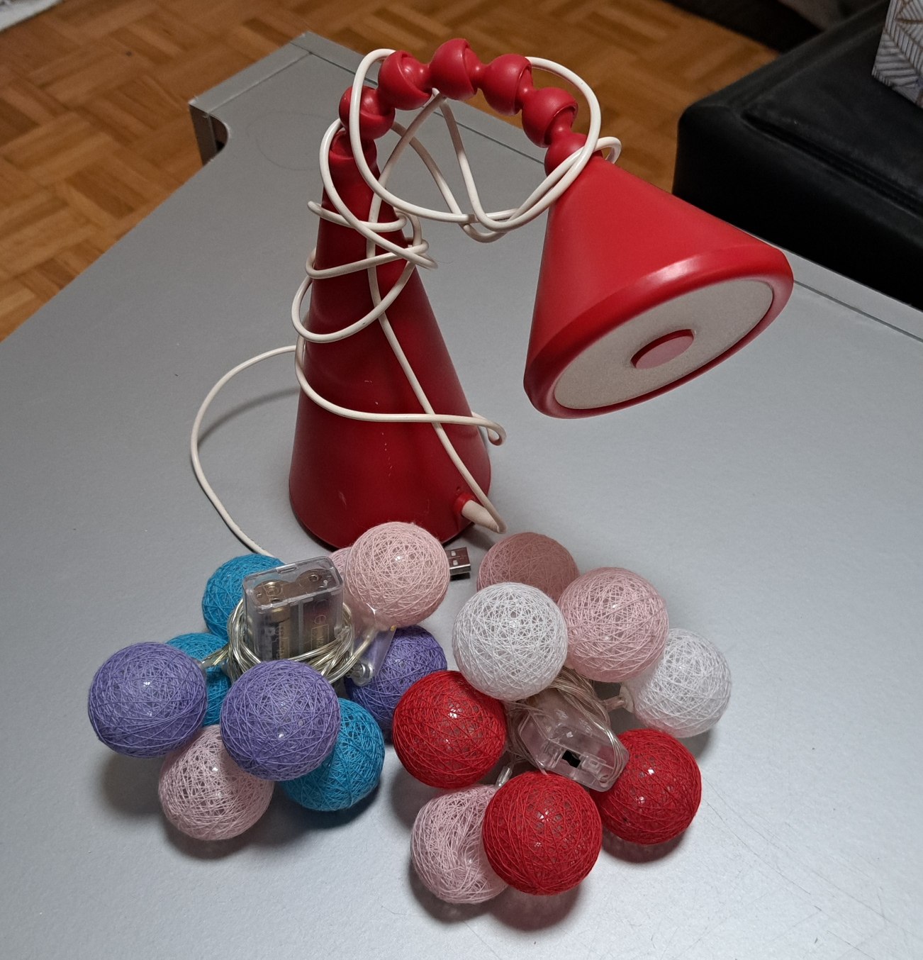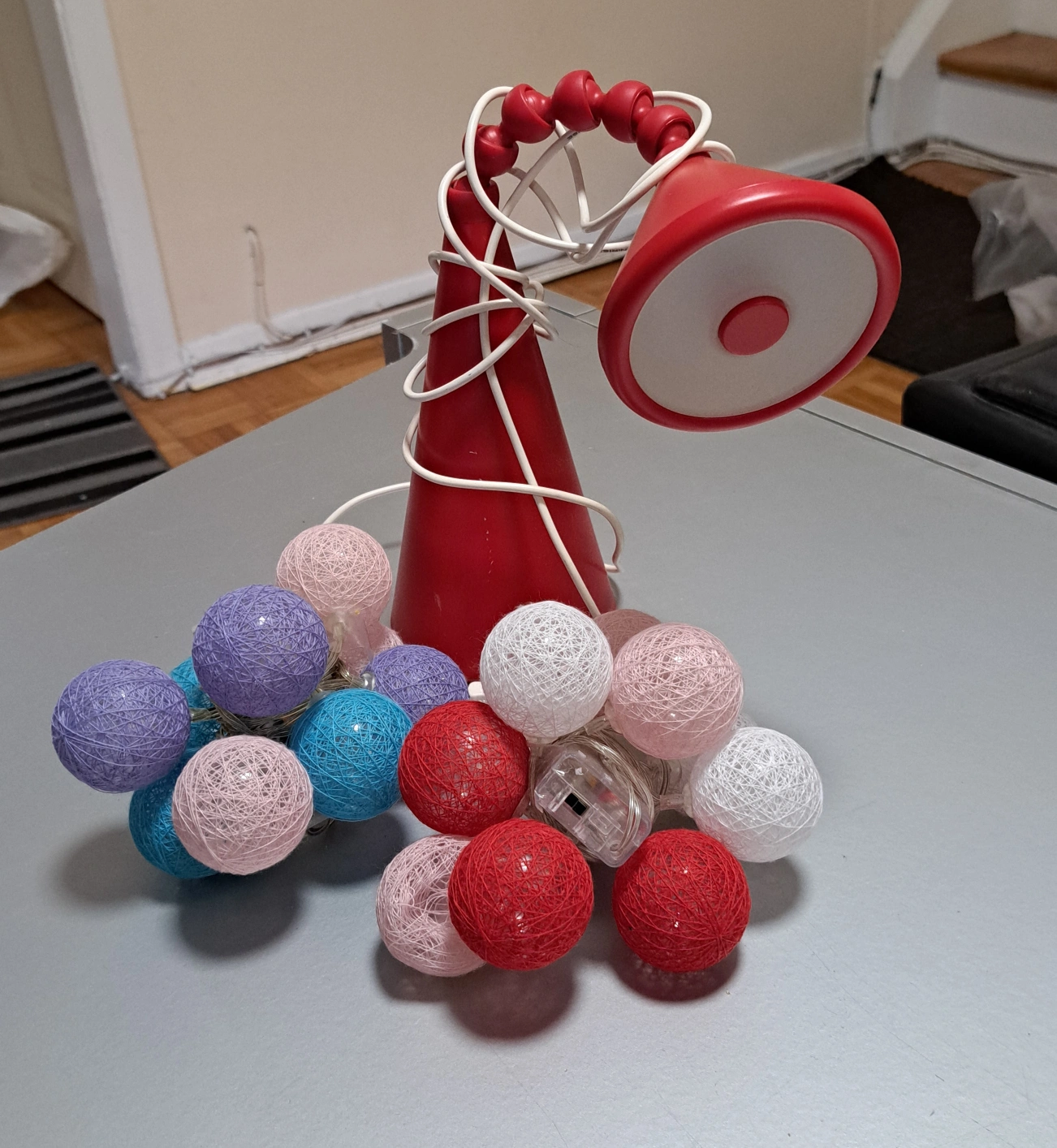 Selling a fun red IKEA lamp! It comes with a string of colourful lights wrapped around it, adding a playful touch to any room. Great for a kids' room or as a quirky accent piece in your living space.