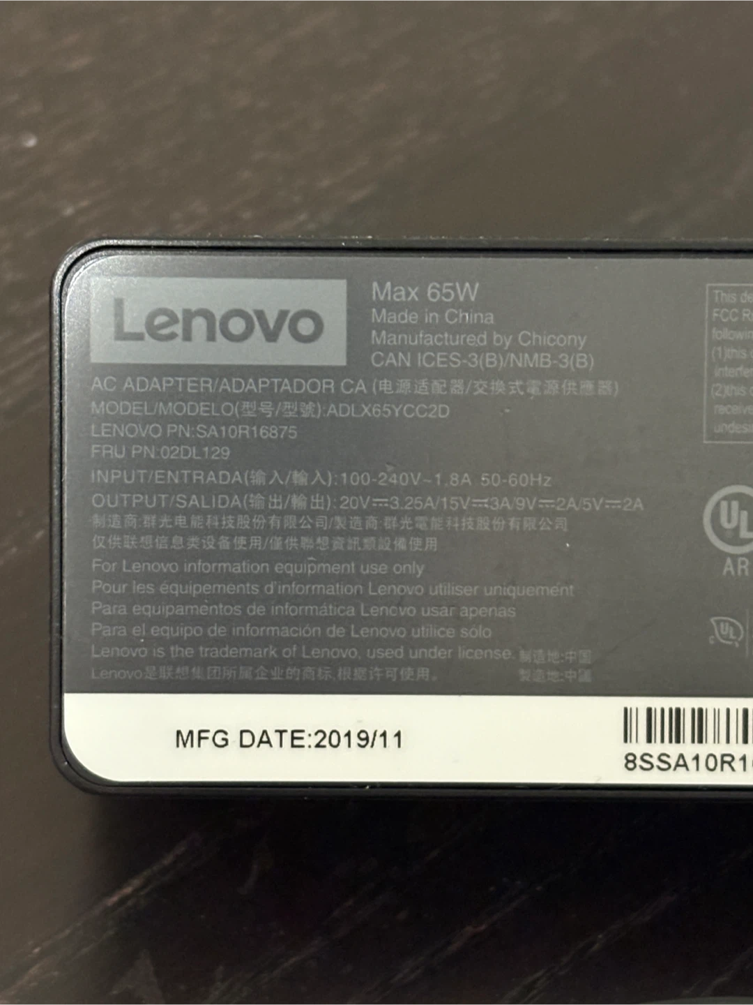 Selling a Lenovo 65W AC adapter. It's in good condition and ready to power your Lenovo device! It is a Max 65W adapter manufactured by Chicony. The model number is ADLX65YCC2D. Manufacturing date is 2019 November.