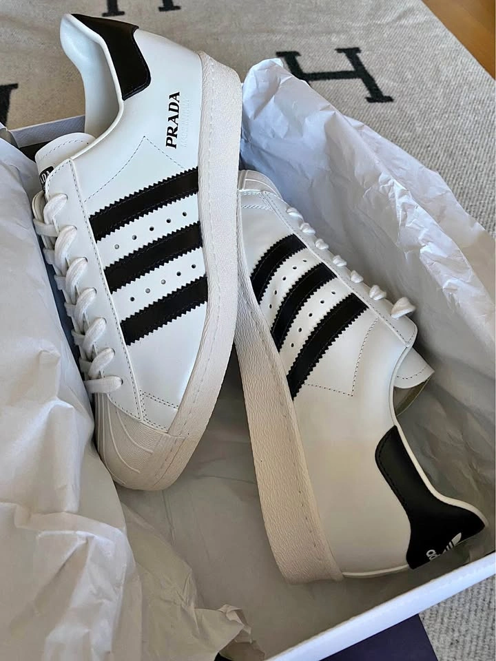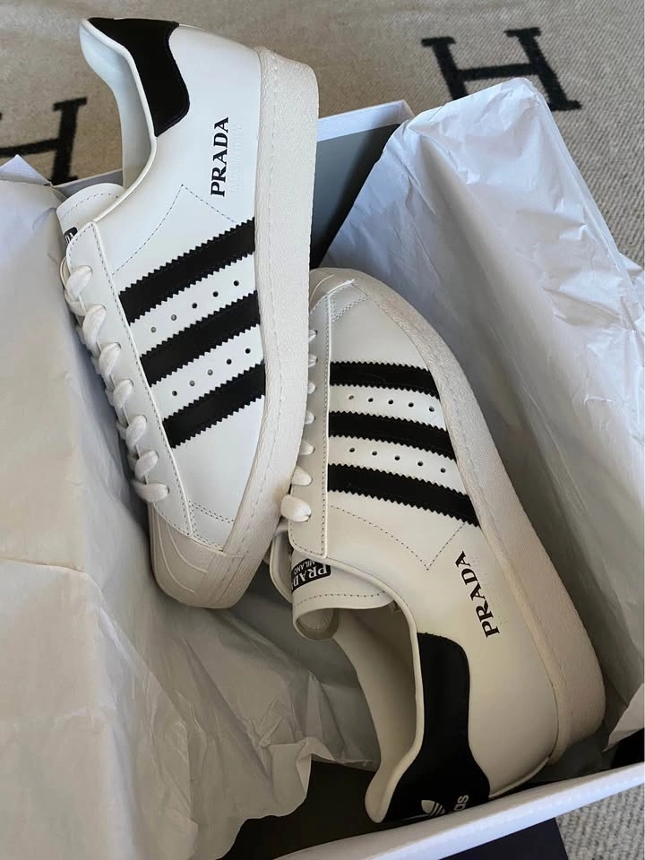 Step into iconic style with these Prada x Adidas Superstar sneakers in US size 8.5. Hand made in Italy with premium caf leather. These sneakers feature a sleek white premium calf leather upper, accented by the classic black Adidas stripes and Prada branding. The shoes are in excellent condition, having been gently worn and well-cared for. Bought from Ssense for $785, with box and online record.