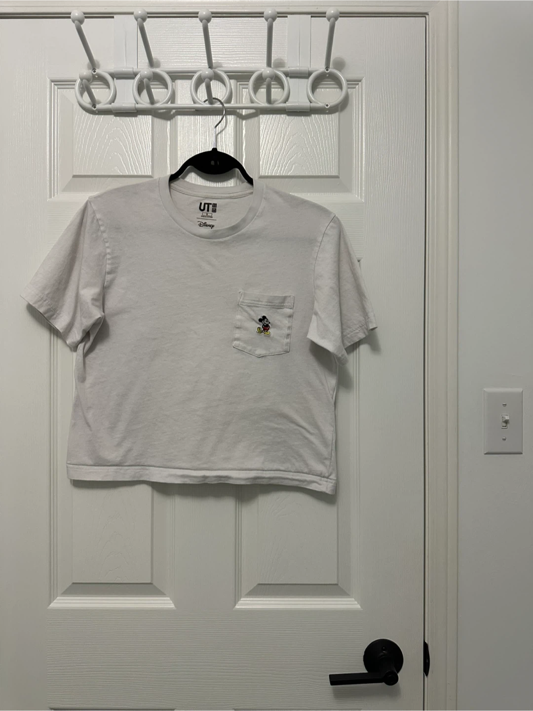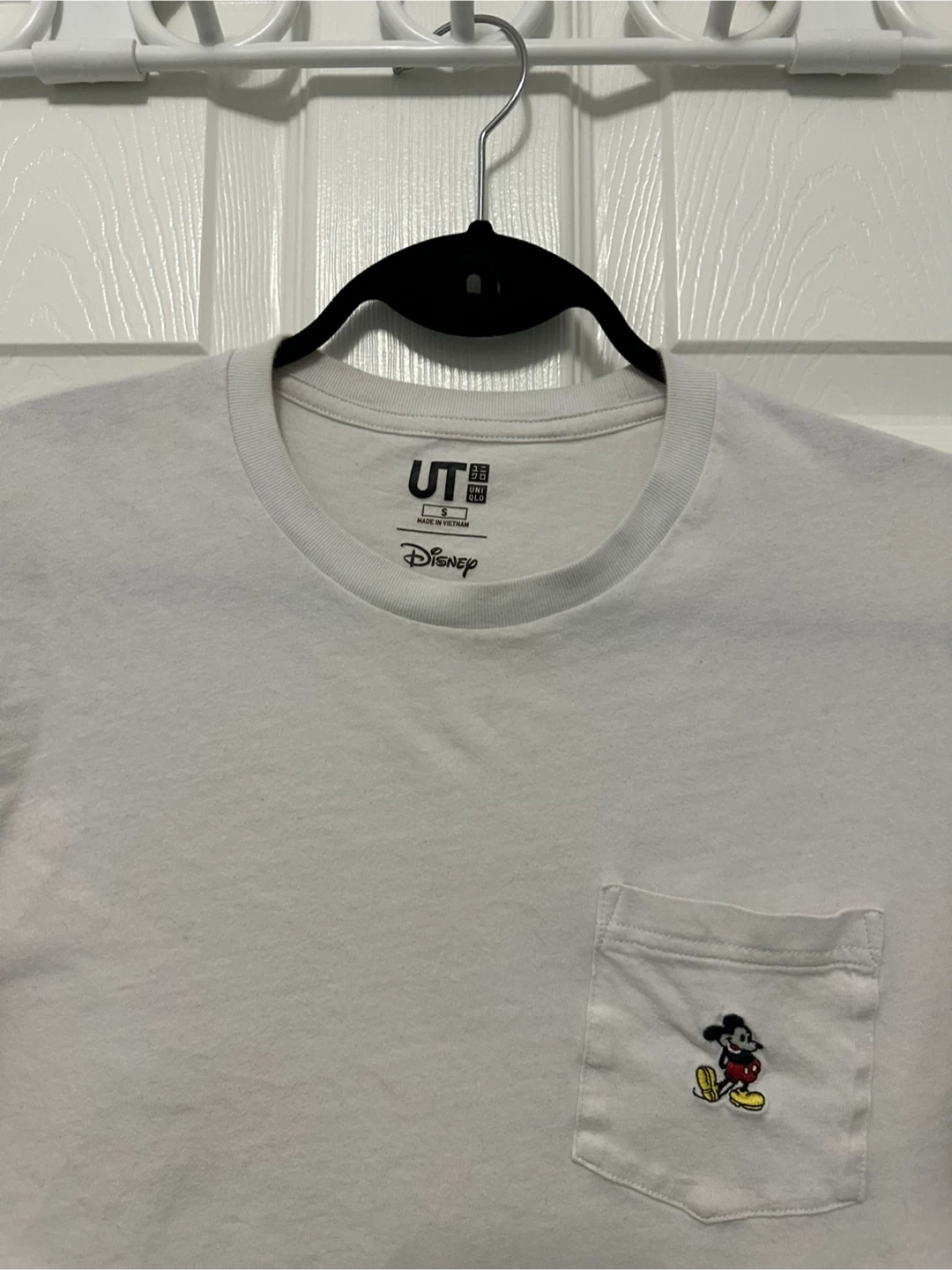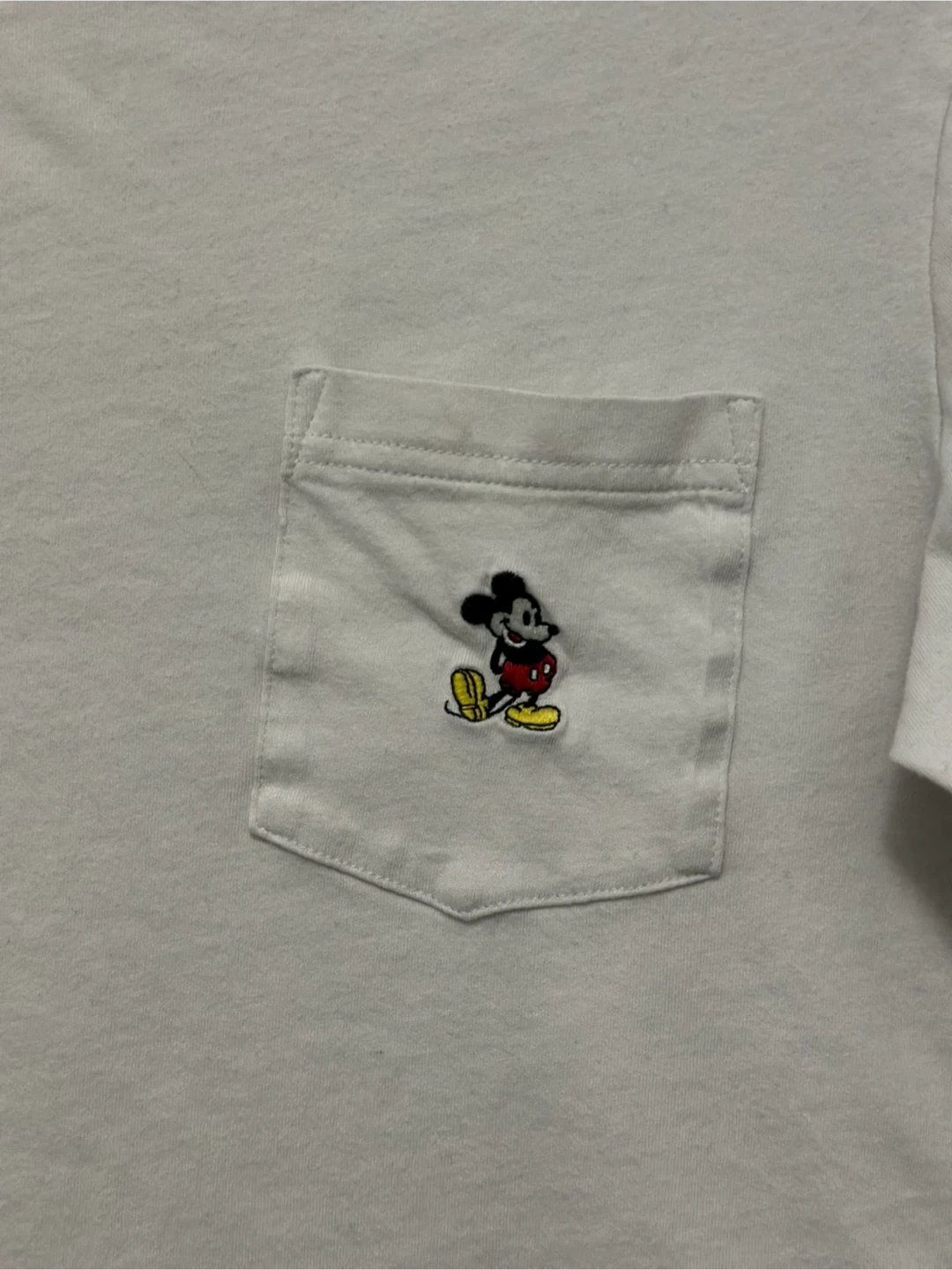 Selling a cute Uniqlo UT Disney T-shirt featuring Mickey Mouse! This white tee is in great condition and has a pocket with a Mickey Mouse design. Perfect for Disney fans!