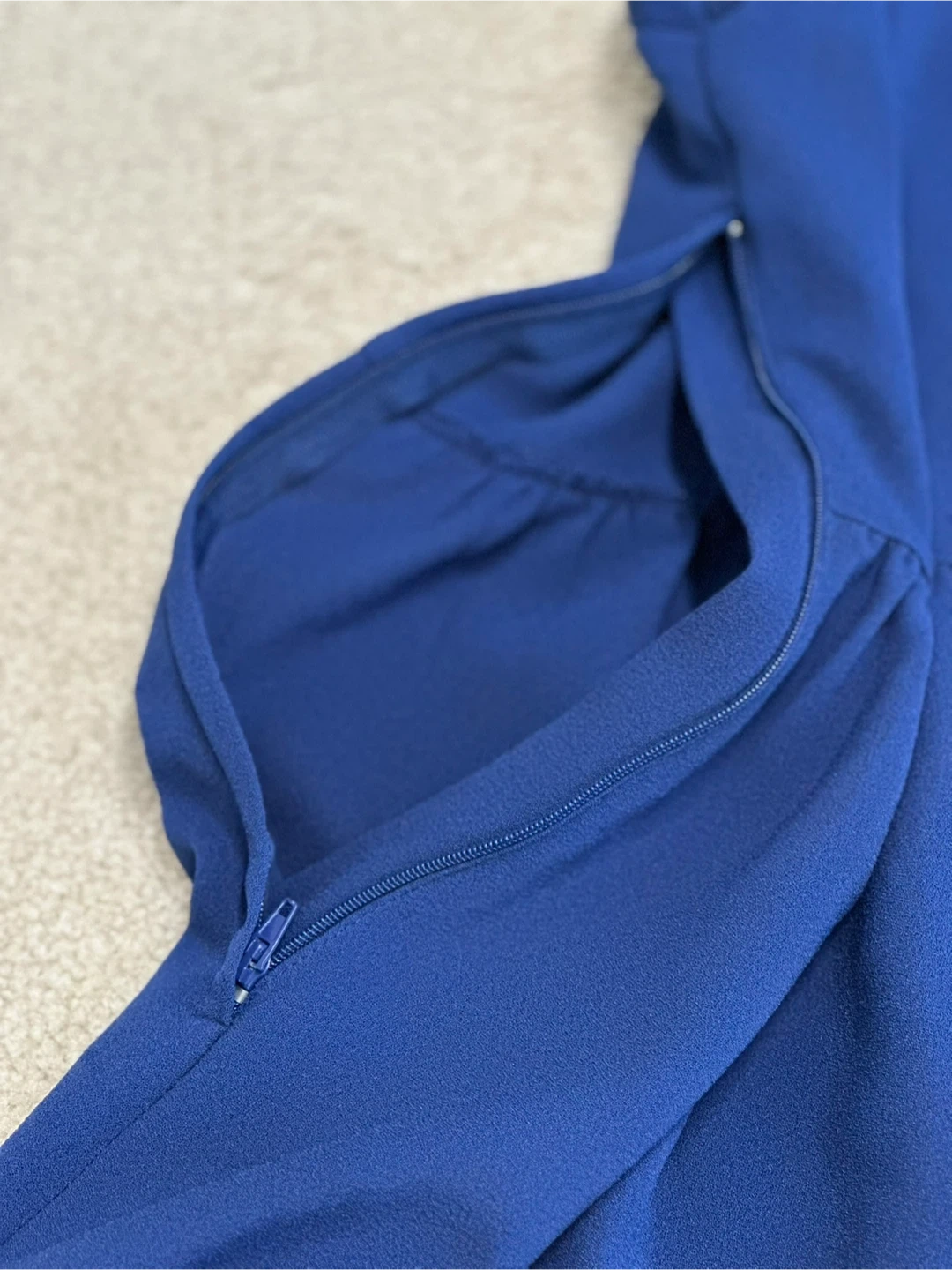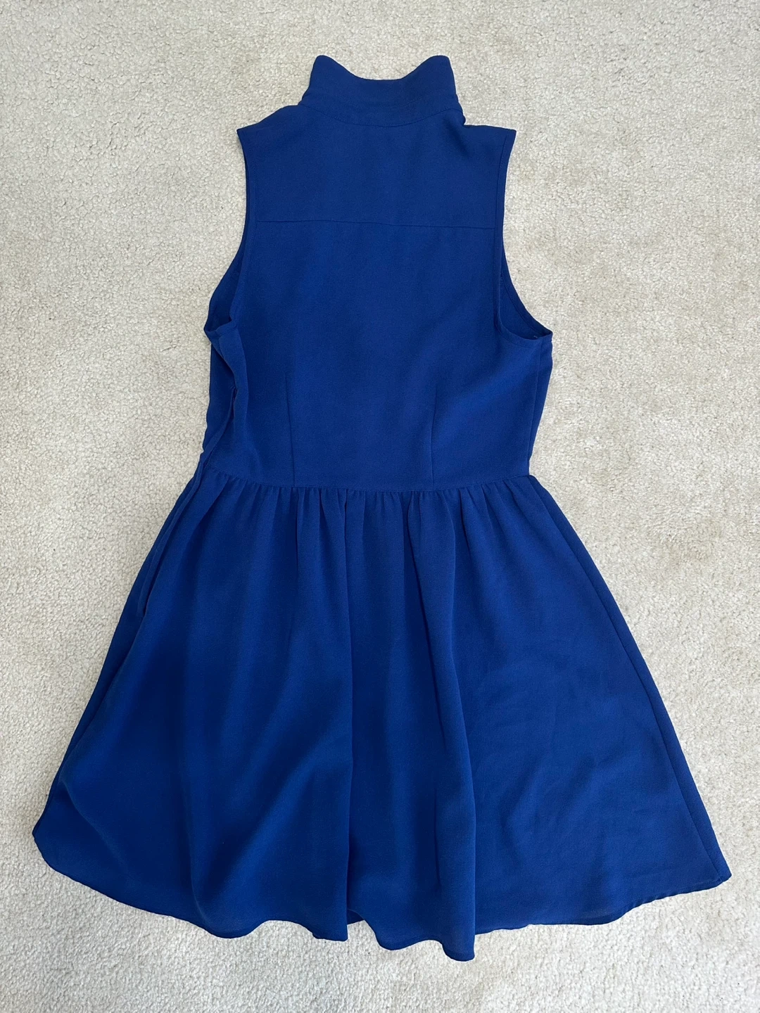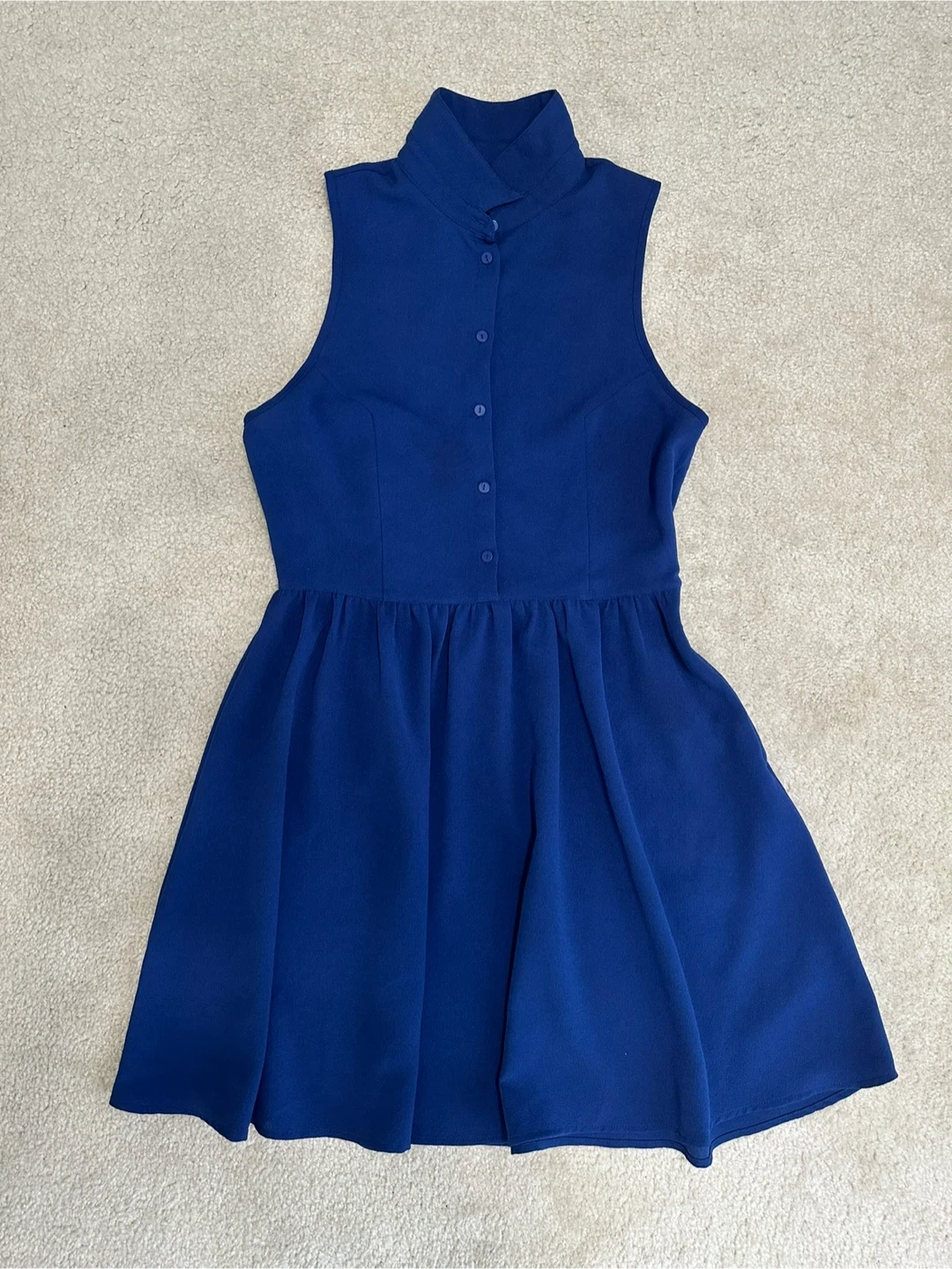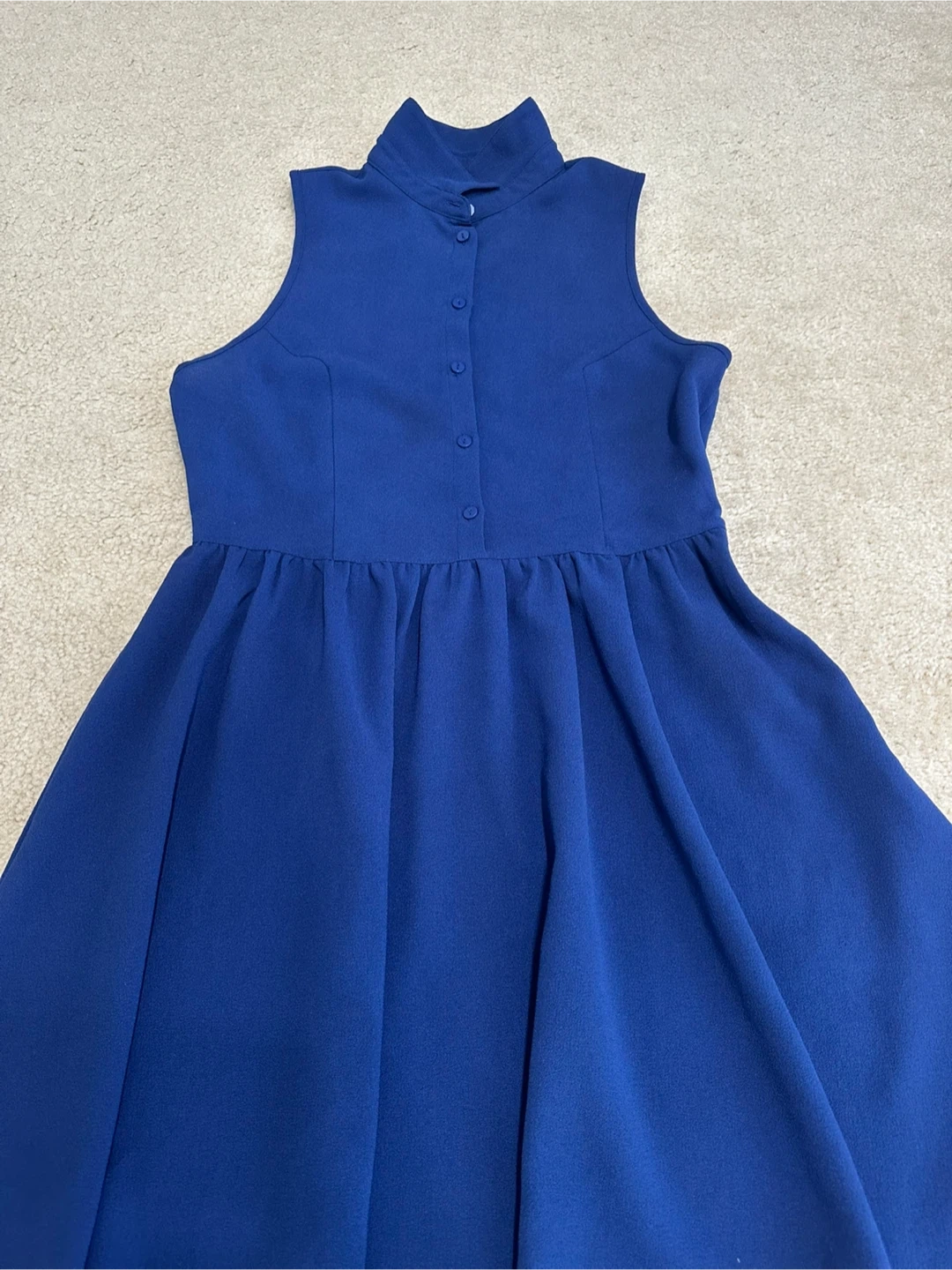Here's a lovely blue sleeveless dress! It features a high neck with button detailing and a flared skirt. Perfect for a day out or a special occasion! It has a zipper on the side.