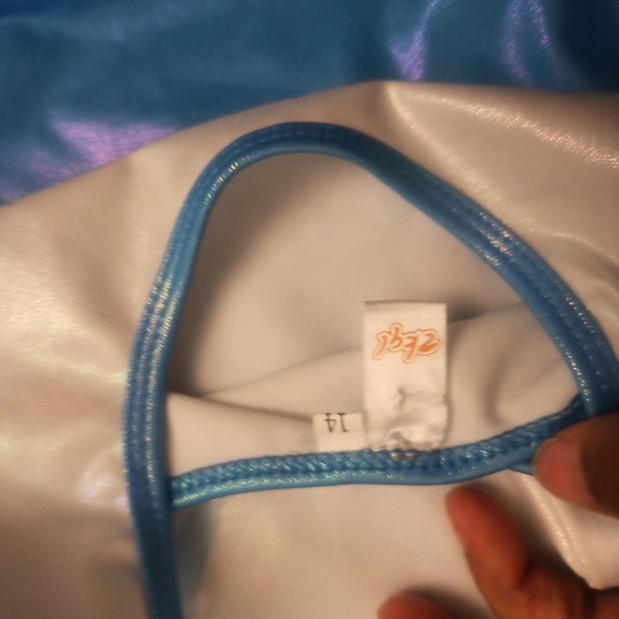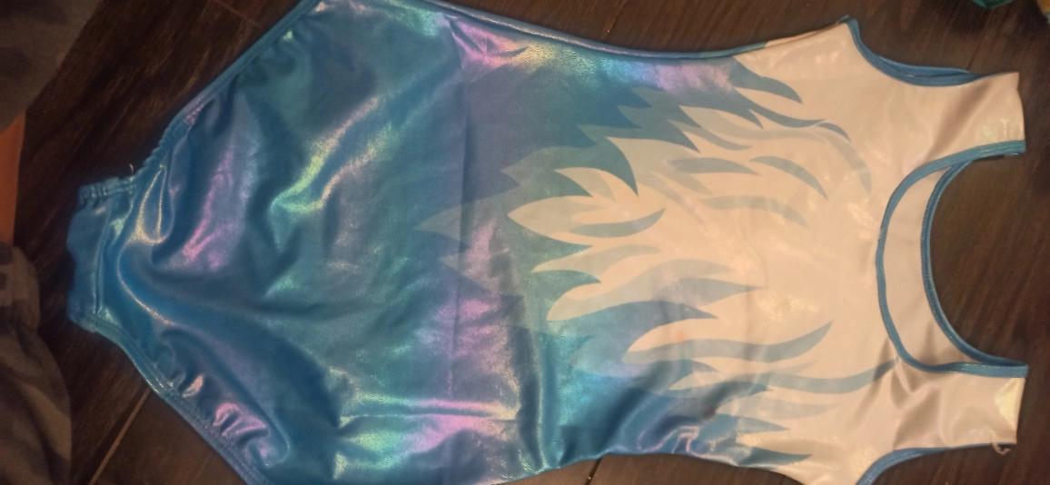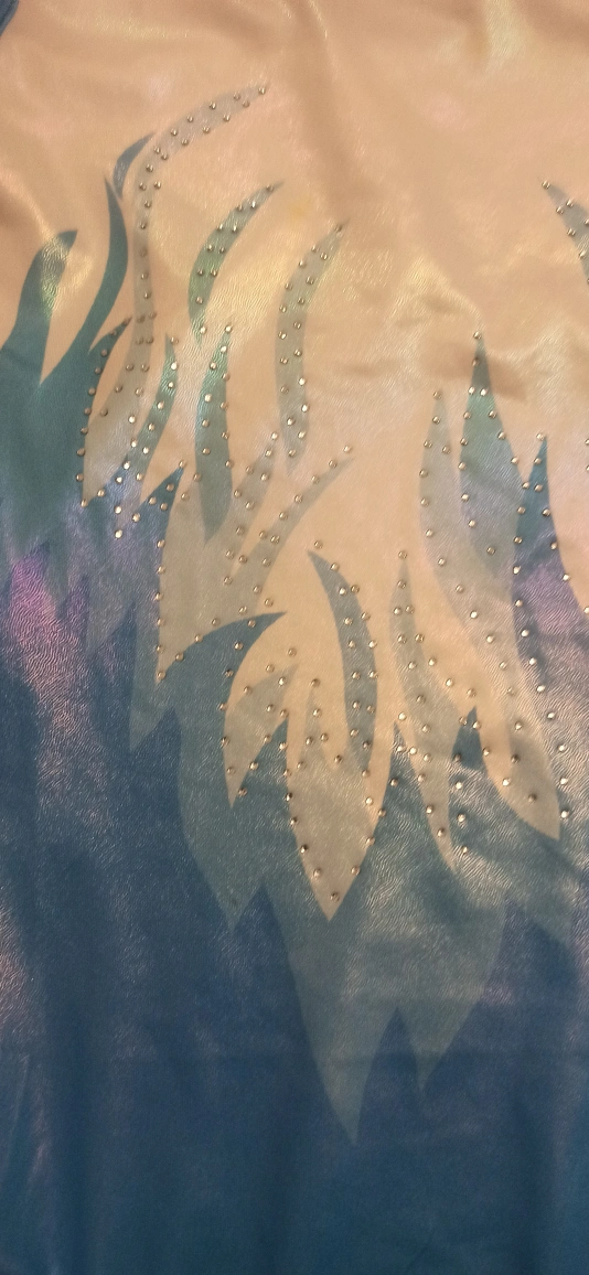 86Here's a beautiful Elite Sportswear gymnastics leotard up for grabs! It's a size 14 and features a unique flame design in shades of blue and white. Perfect for your young gymnast!