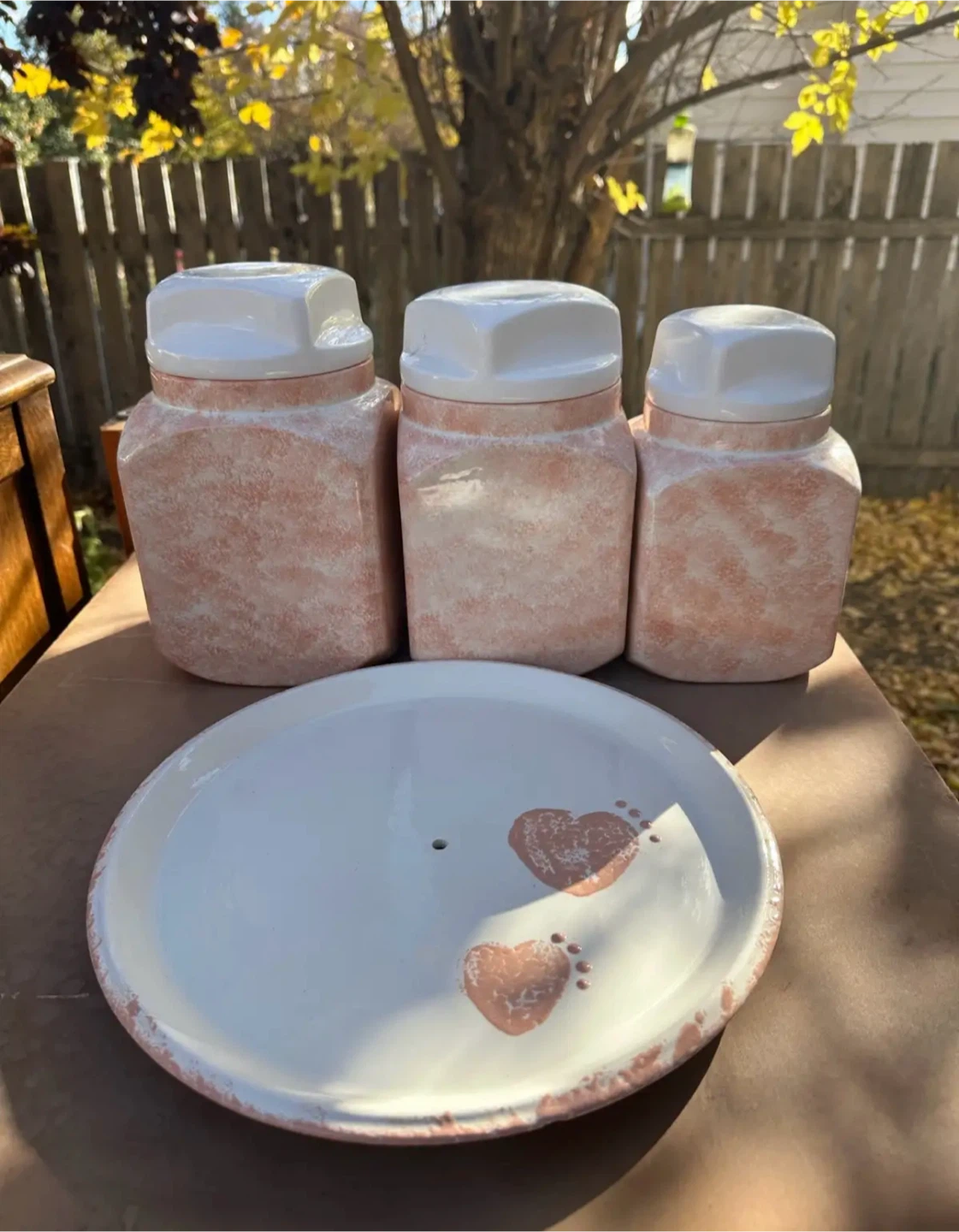 Selling a set of ceramic canisters with a matching plate. The canisters have a unique speckled design with white lids, and the plate features heart details. Perfect for adding a touch of charm to your kitchen!