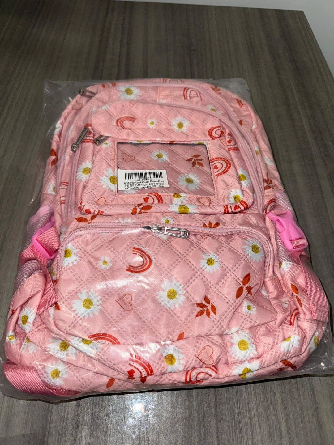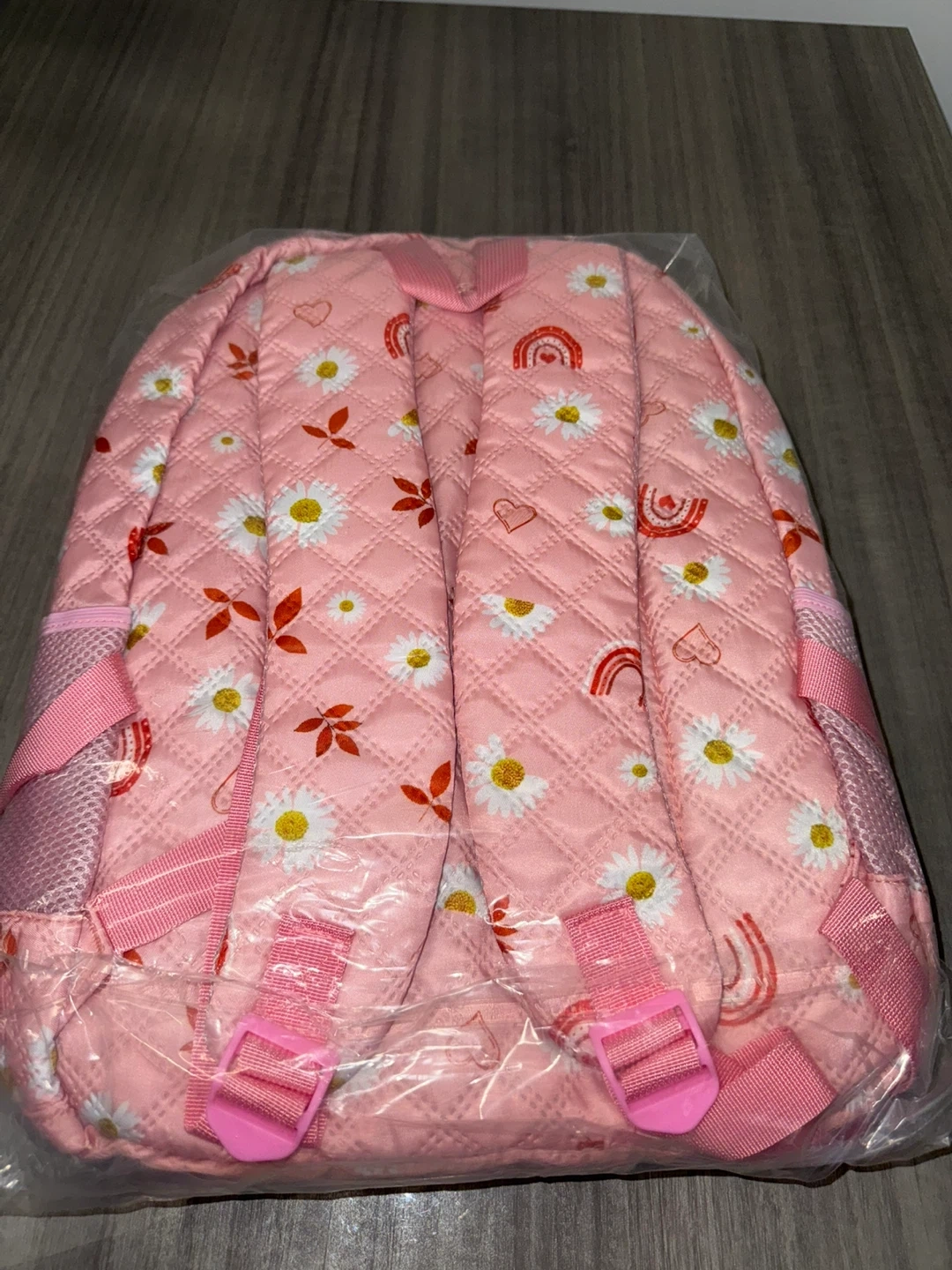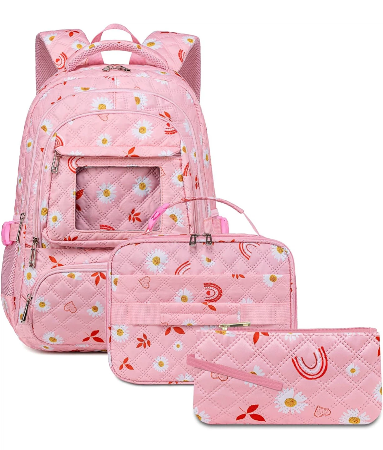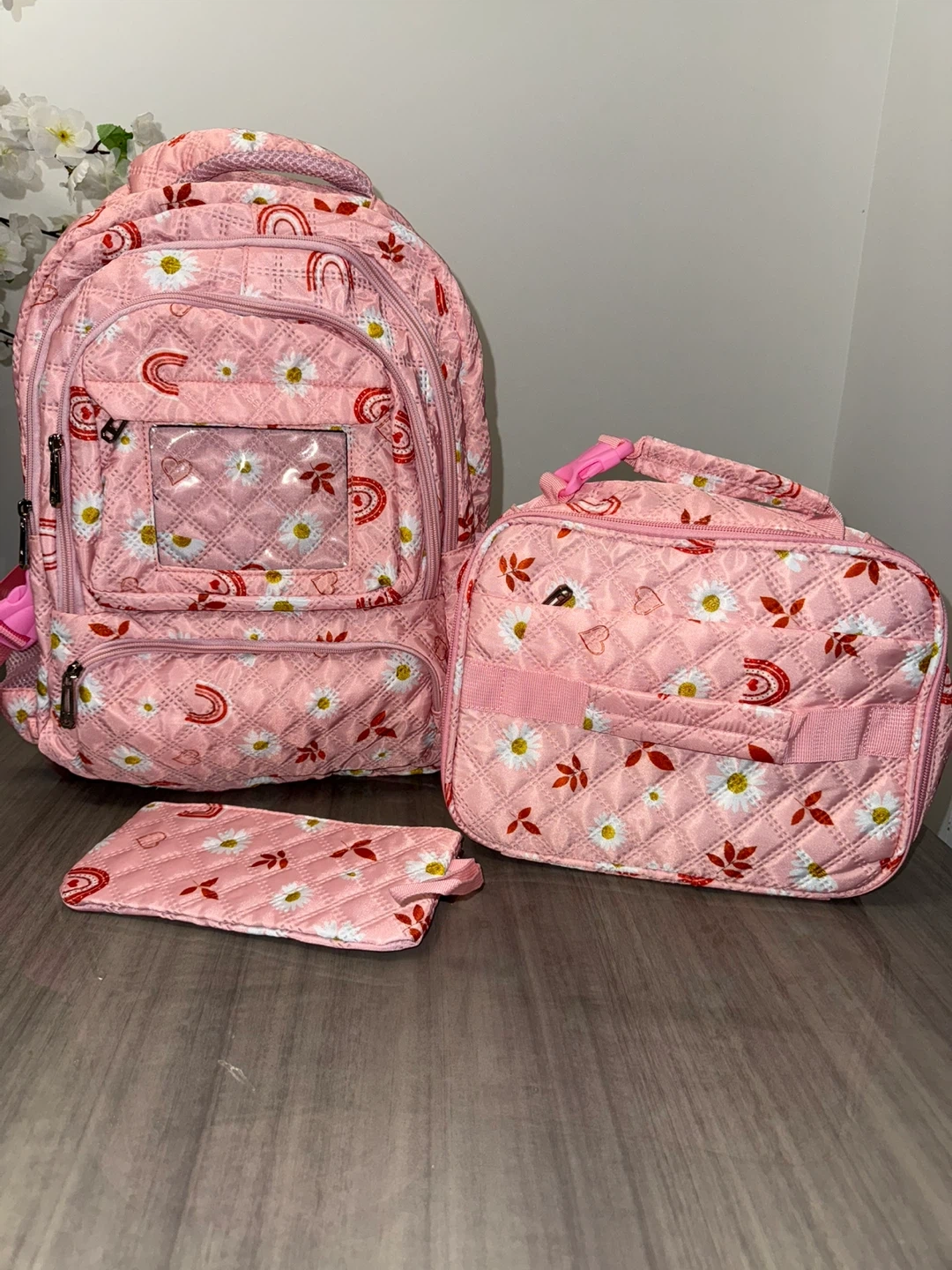 Here's a super cute pink quilted backpack set! It comes with a backpack, a lunch bag, and a pencil case, all in a matching floral pattern. Perfect for school or travel!