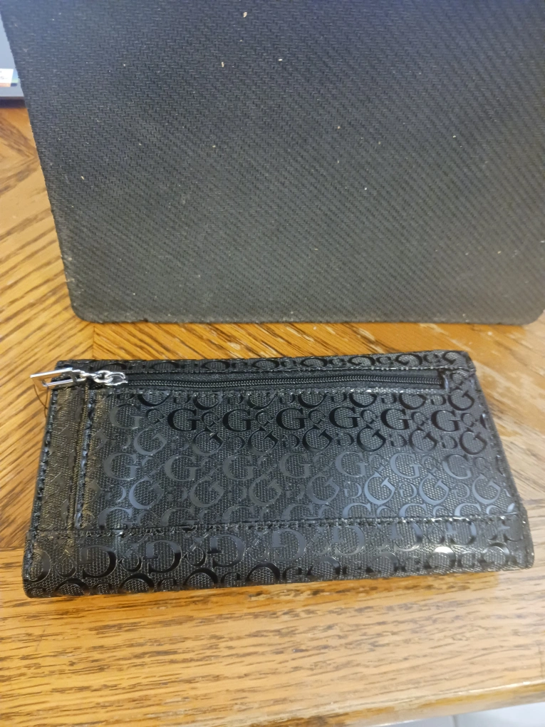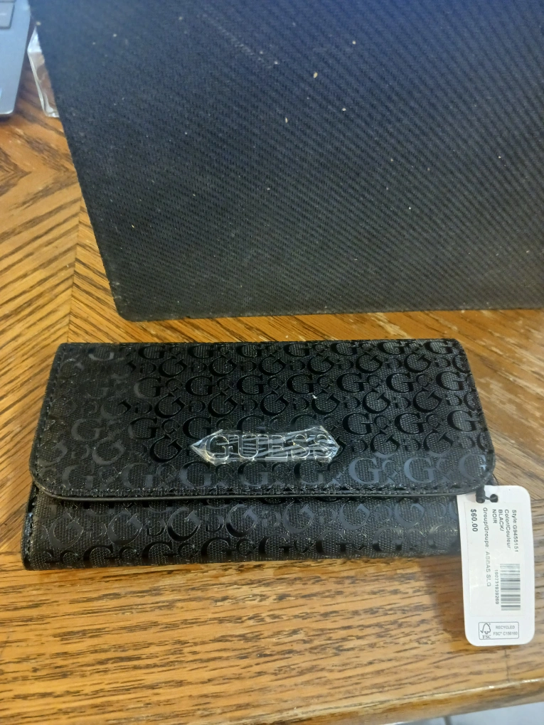 Selling a Guess wallet in black! It's in great condition and features the Guess logo pattern throughout. The tag shows the original price was $60.00