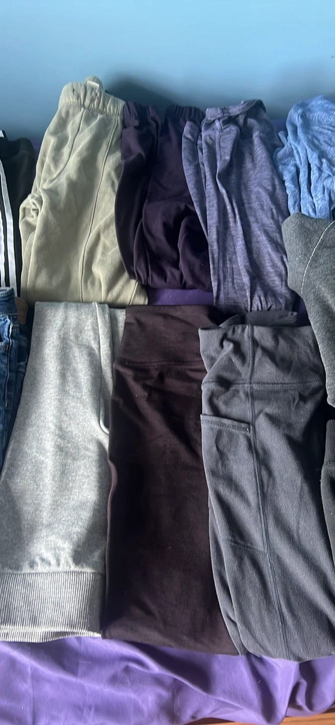 A mixed lot of clothing including jeans, sweaters, and leggings. Brands include Adidas, New Balance, and more! Various sizes and colours available. Perfect for building your wardrobe!