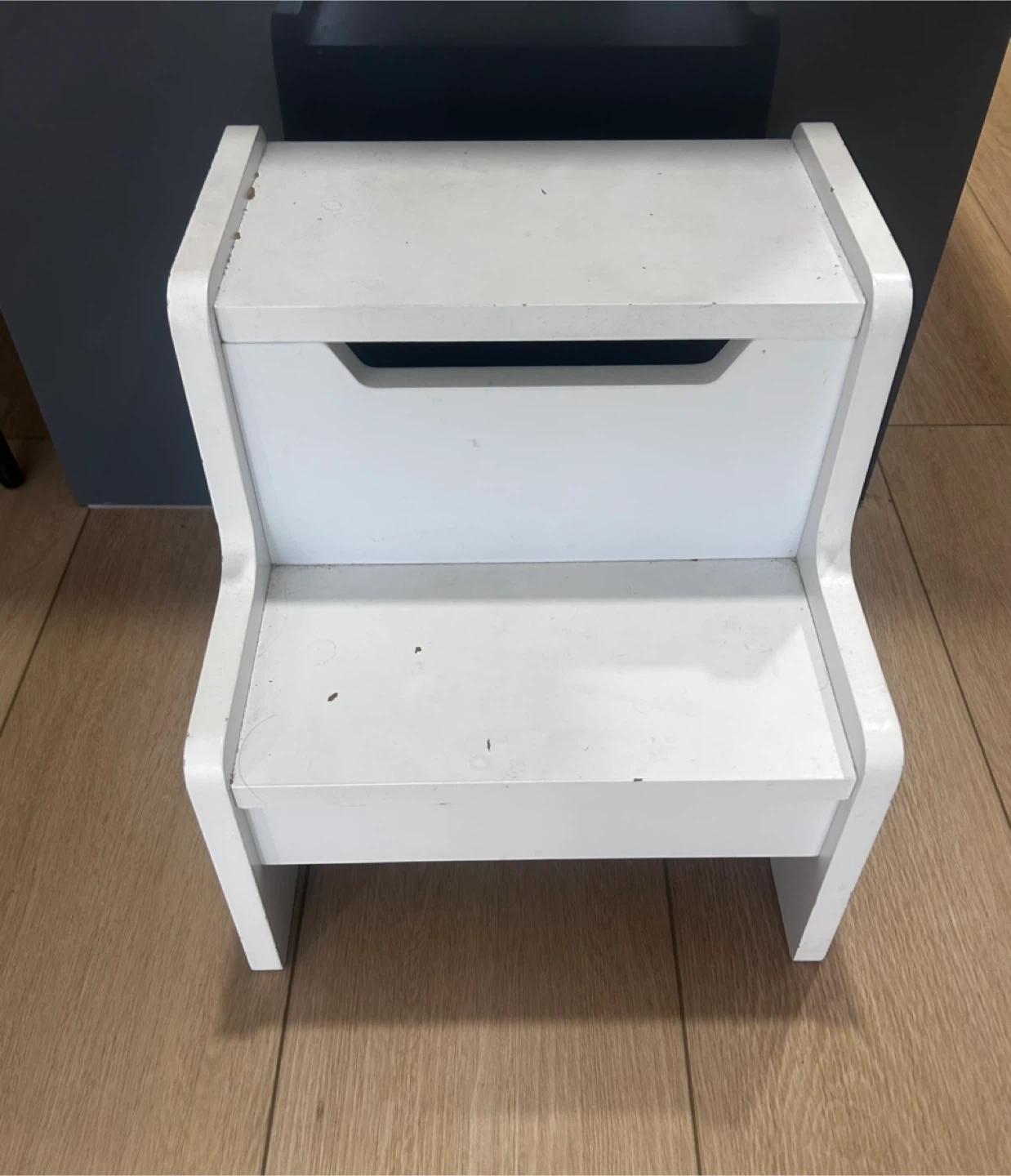 Here's a handy little white wooden step stool. It has two steps and a handle. It's perfect for kids to reach high places, or just as a decorative piece. There are some signs of wear.