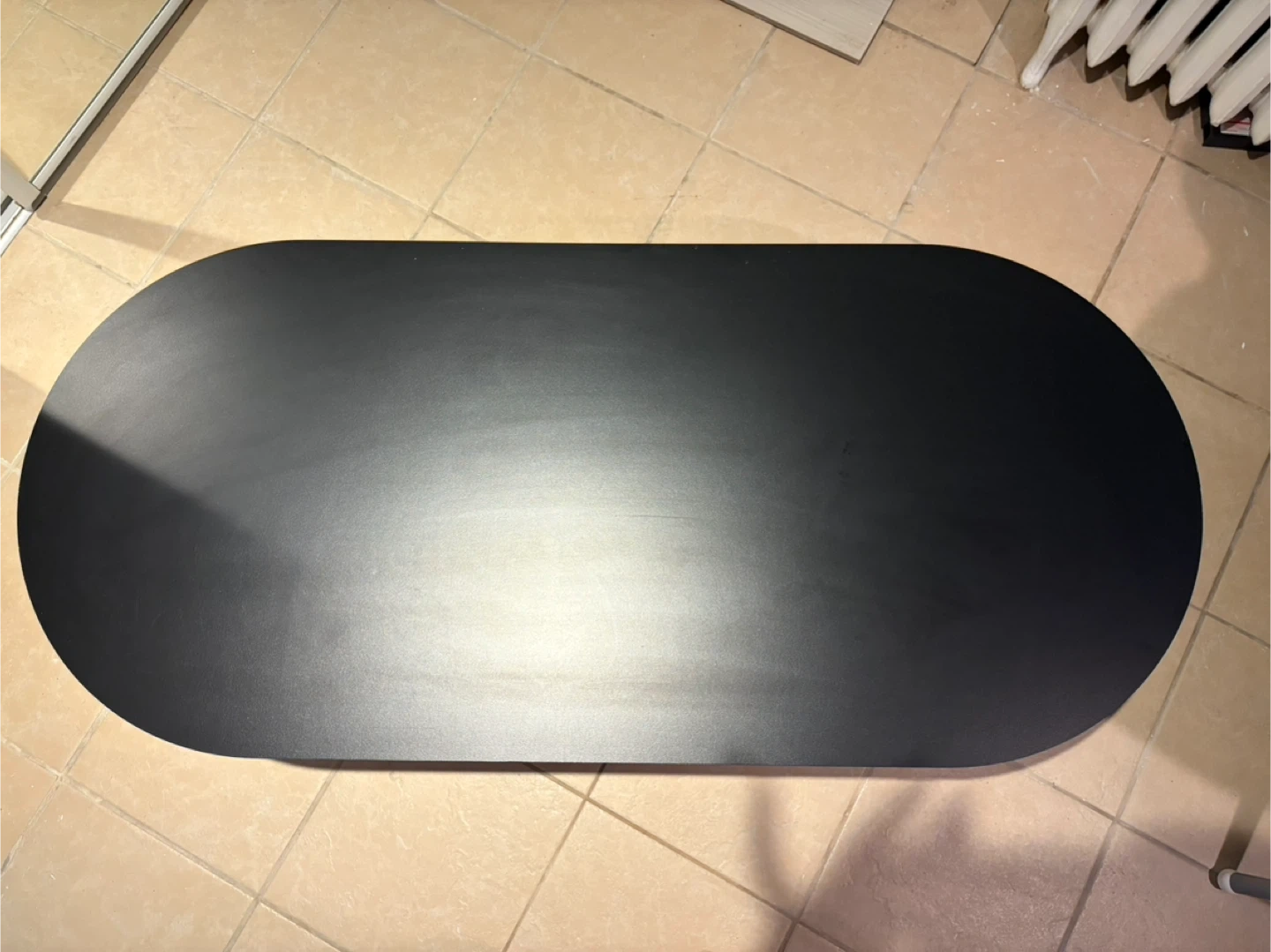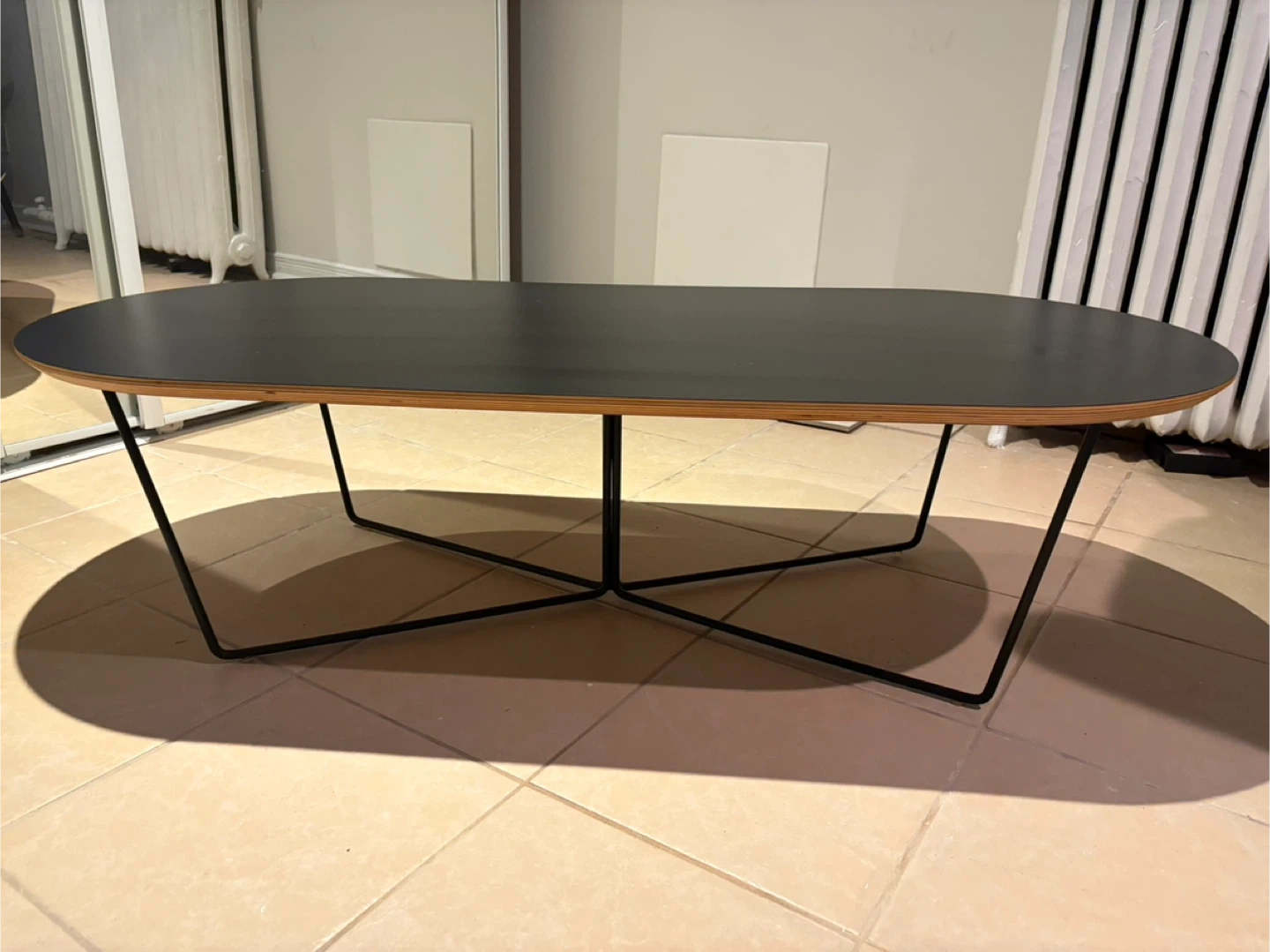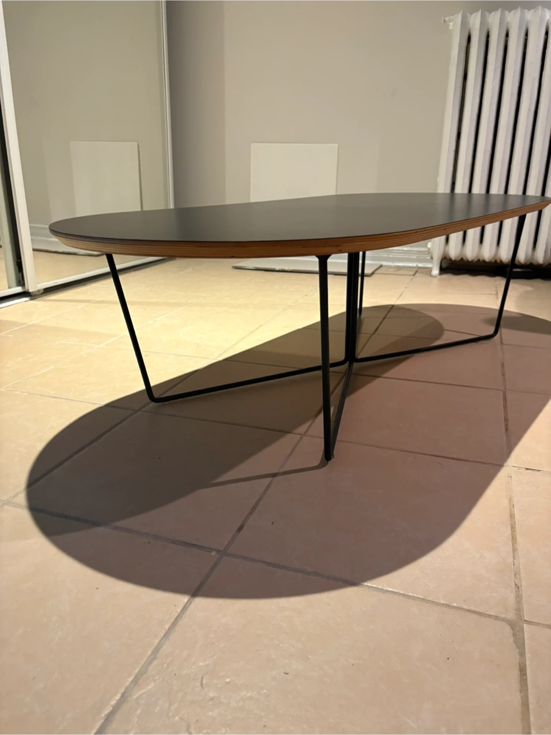 20The Array Oval Coffee Table from Style Garage on Ossington! Lovely low profile coffee table with a geometric base. The oval top has a beveled, exposed-ply edge and a durable, laminate surface. In great condition - a couple small scratches on the top of the table. Original price $995