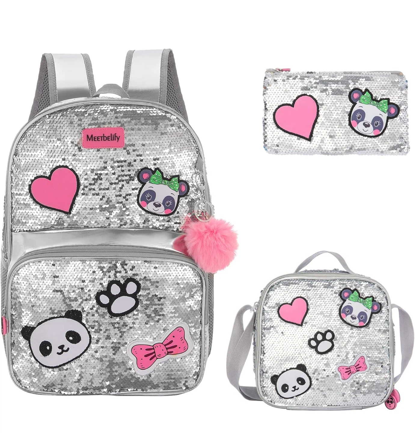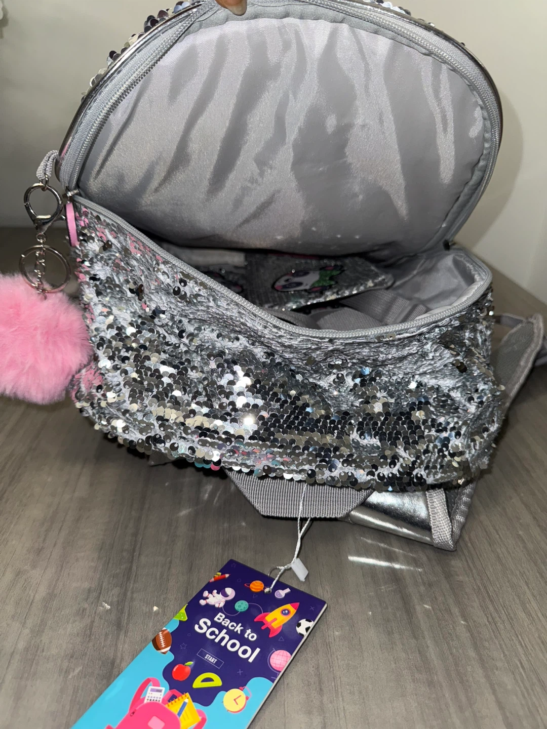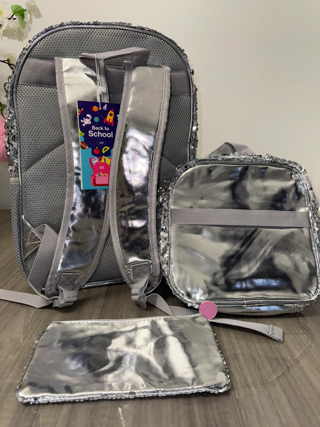 Brand new MeetBelify backpack set! This adorable silver sequin set includes a backpack, lunch bag, and pencil case. Perfect for back to school!