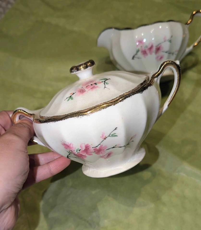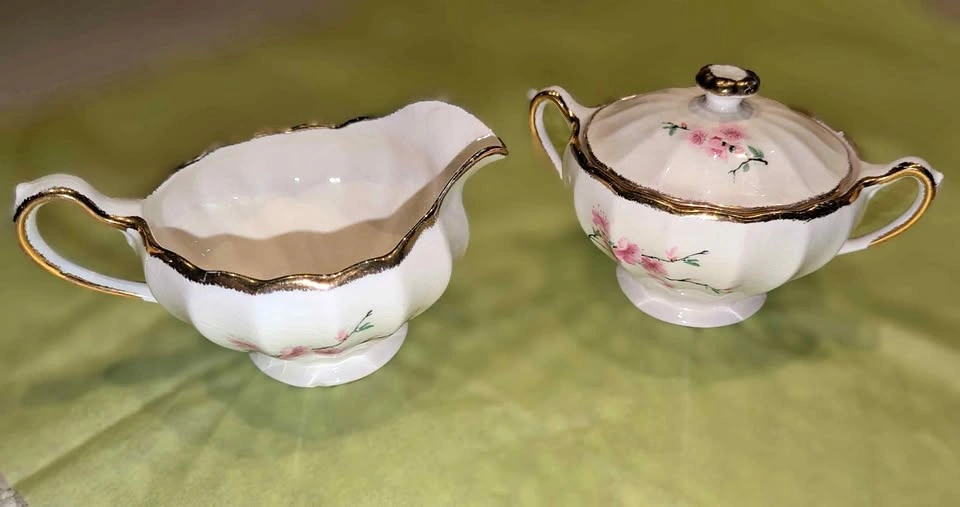 Lovely vintage 'Peach Blossom' porcelain cream and sugar set with lid, featuring hand-painted pink florals and 22-karat gold trim.