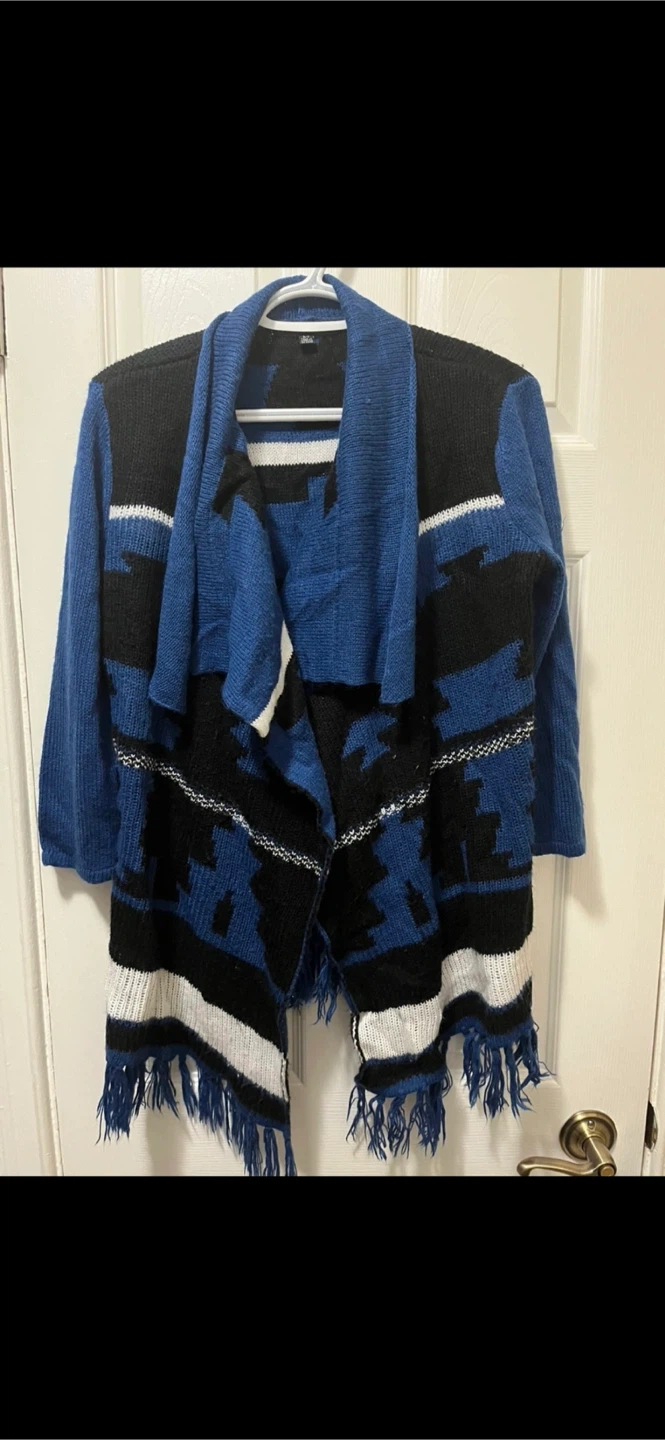 This is a lovely cardigan with an Aztec-inspired print in blue, black, and white. Perfect for layering and adding some flair to your outfit. •Pick up at 385 Osler Street.