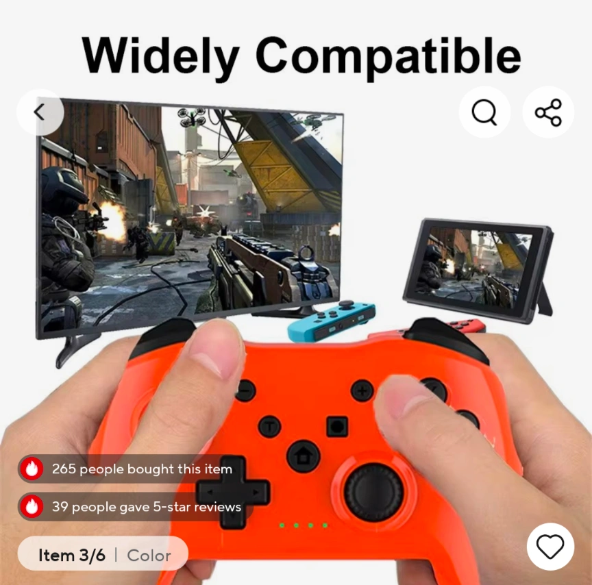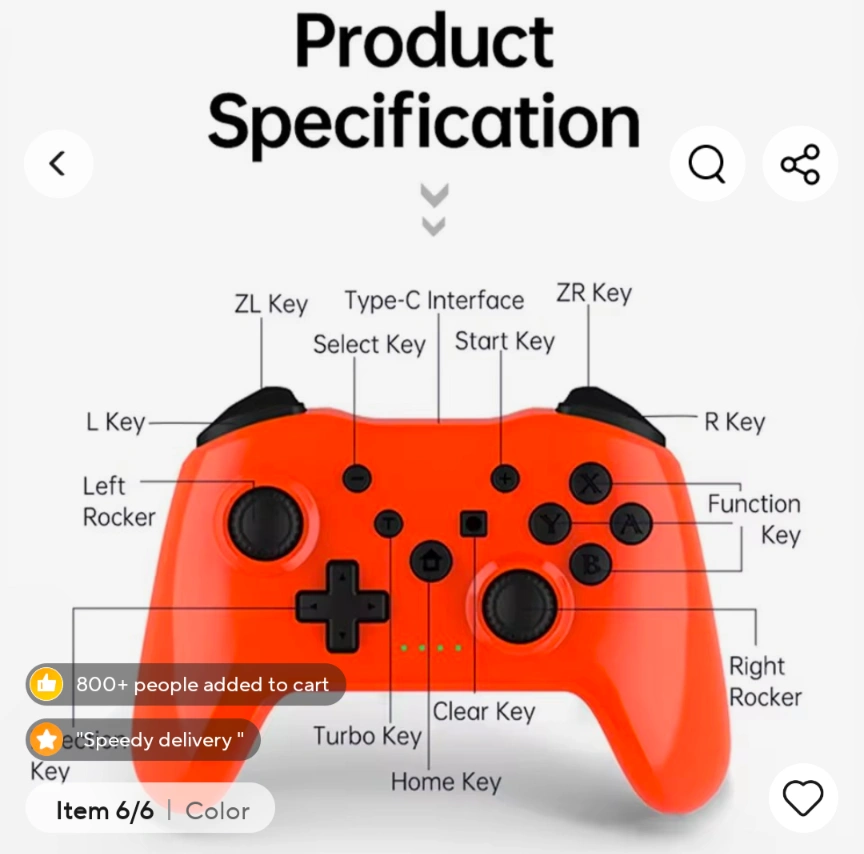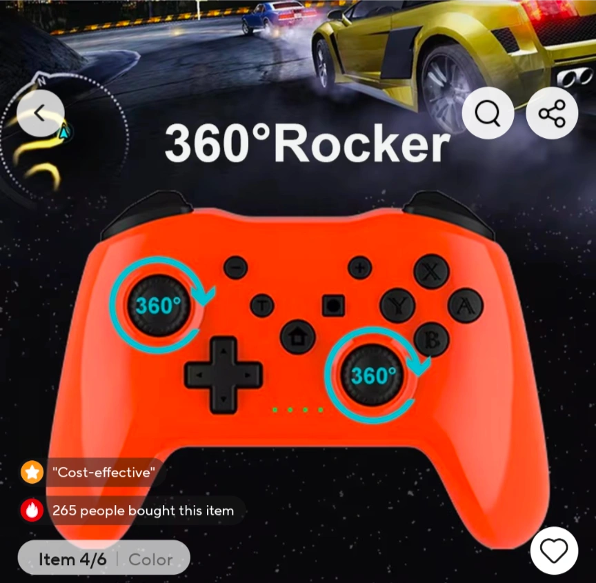 Selling a Gaminja wireless controller in orange. It's compatible with N-Switch, PS3, Smart TV and PC. It features a 360° rocker and a Type-C interface.