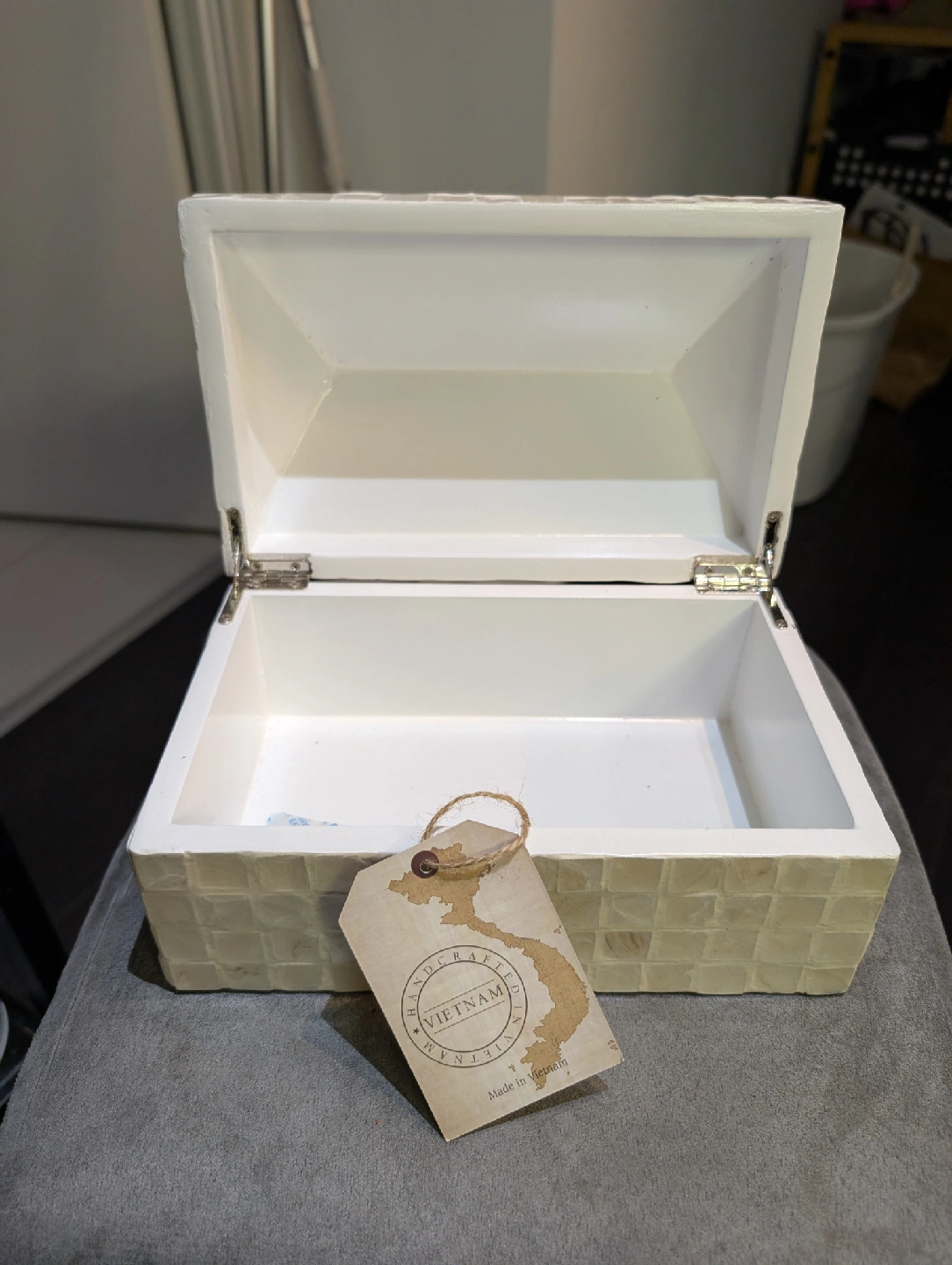 Here's a lovely decorative box made with mother of pearl tiles. It's brand new and would look beautiful on a dresser or shelf. The box was made in Vietnam.