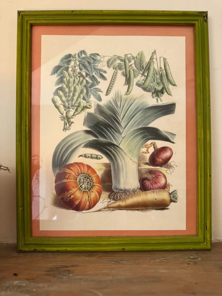 Professionally framed in a rustic, distressed lime-green frame.