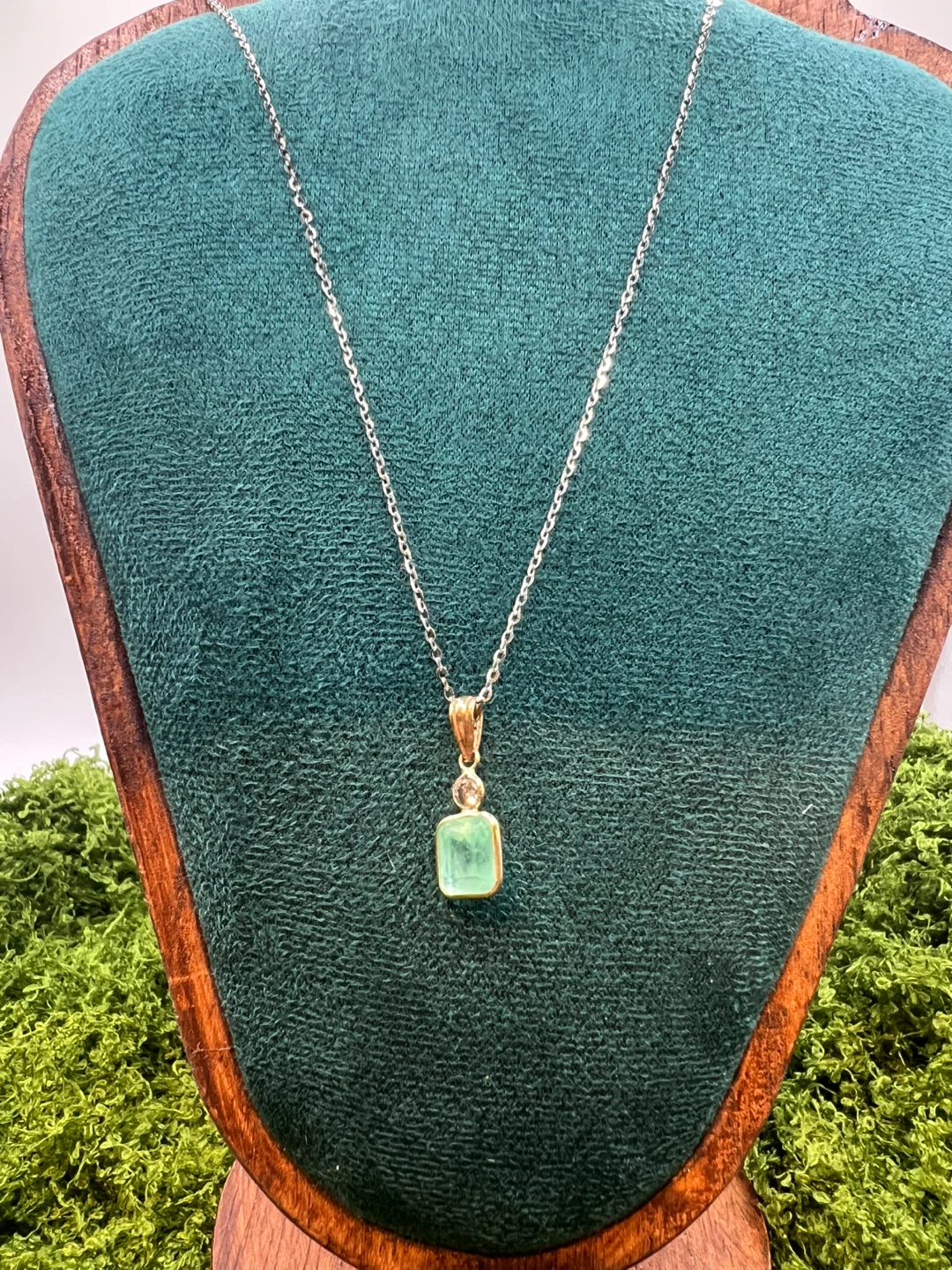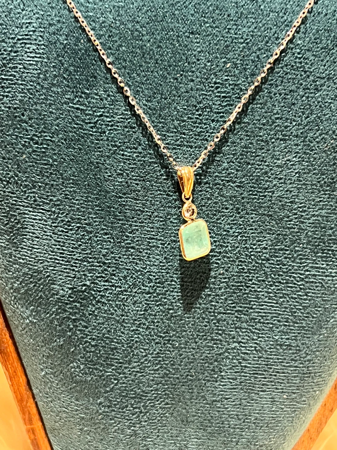 Beautiful emerald pendant necklace with a small diamond surrounded by 18kt gold. The pendant features a square-cut emerald stone weighing in at 2.34ct . It's in great condition and ready to add a touch of elegance to any outfit. This is a great deal and not to be missed!