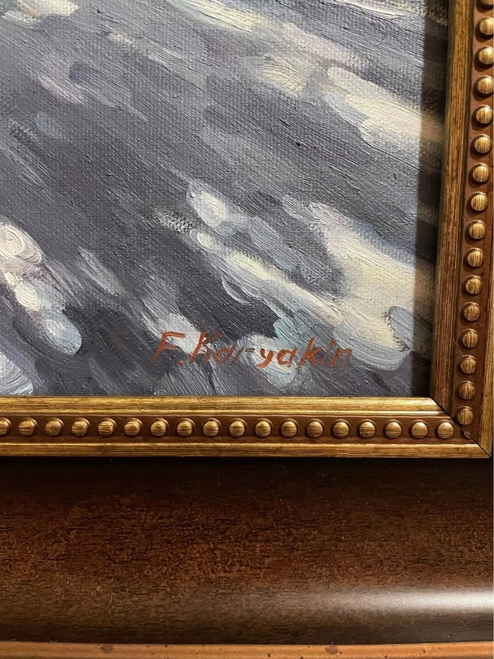 Oil on canvas on the board. Framed (frame has small defects, but still very good-see pictures. I’m selling art. Frame goes like present) 11x14 inch. Signed The painting was created by the artist Fyodor Karyakin. Fyodor Karyakin is a member of the Union of Artists of Russia, and his paintings are held in private collections around the world, including Japan, Israel, Morocco, France, the USA, and others. Local pick up -CASH only