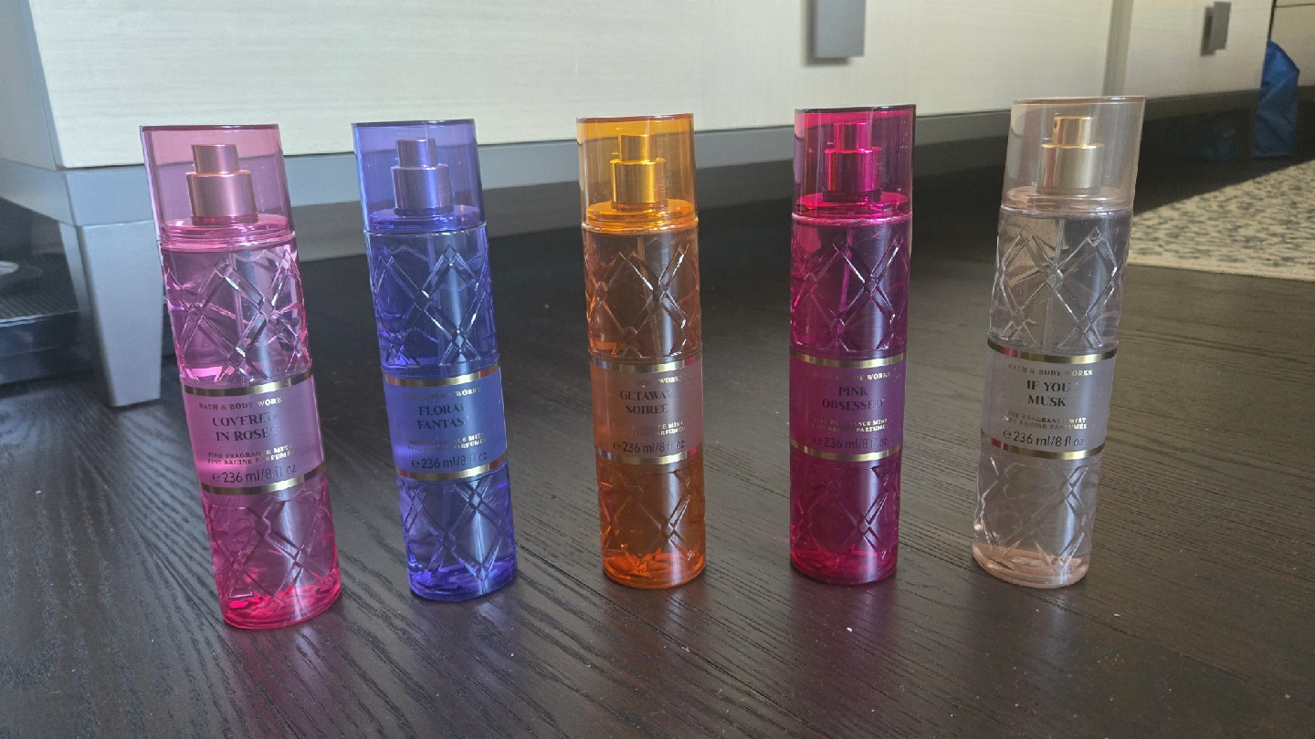 Selling a set of discontinued Bath & Body Works Fine Fragrance Mists! Includes the following scents: - Covered in Roses - Floral Fantasy - Getaway Soiree - Pink Obsessed - If You Musk $10 each or all for $40