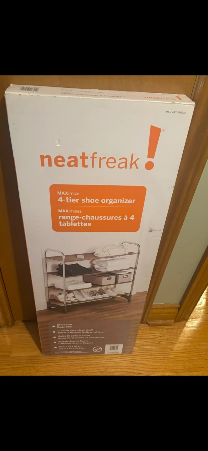 Keep your shoes organized with this Neatfreak 4-tier shoe organizer! It's stackable and has an easy-to-clean shelf. It can hold up to 16 pairs of shoes. The dimensions are 89.5 x 33 x 83 cm (35.2 x 13 x 32.6 in). Stylish chrome frame included. •Pick up at 315 Osler street.