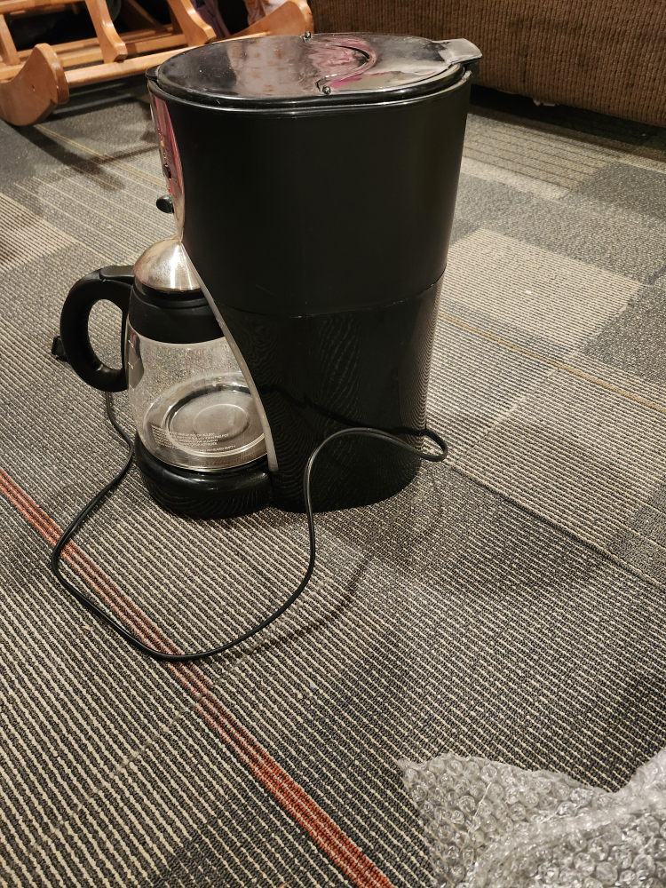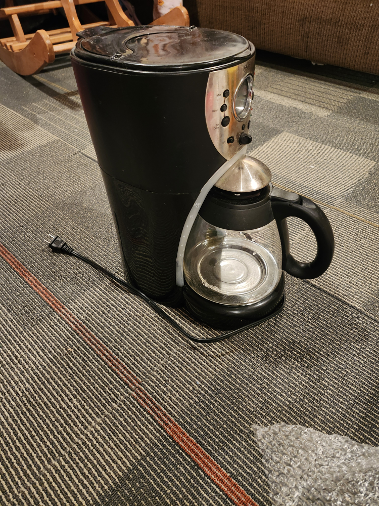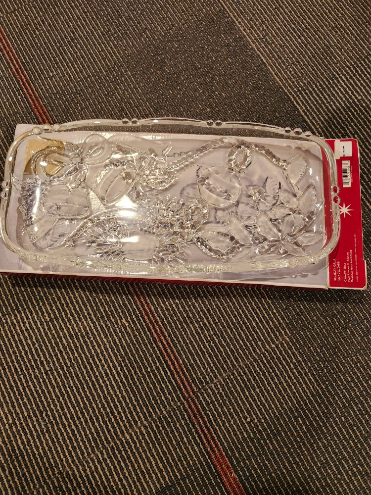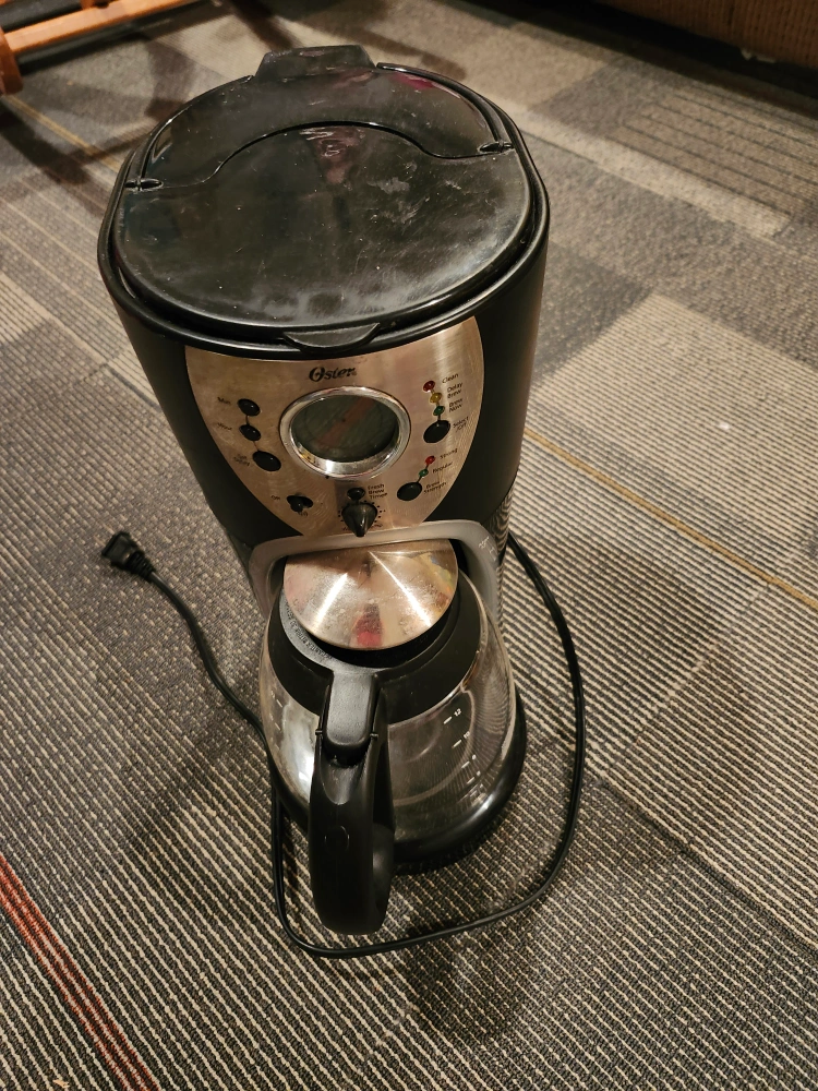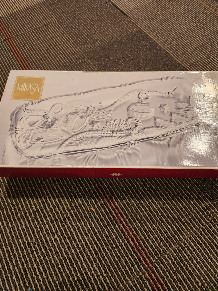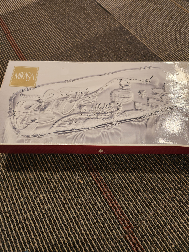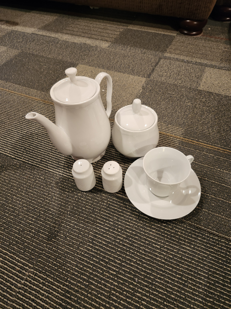 White coffee mugs 6 of them band New Never used with coffee pot sugar bowl salt and pepper shaker Glass tray never used from Mikasa. Holiday Gala canape tray. coffee machine make is from. Oster used a few times still looks New.