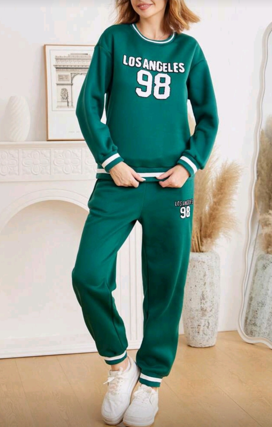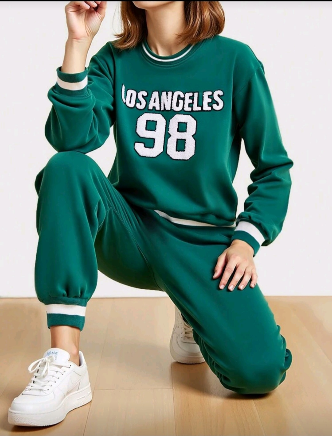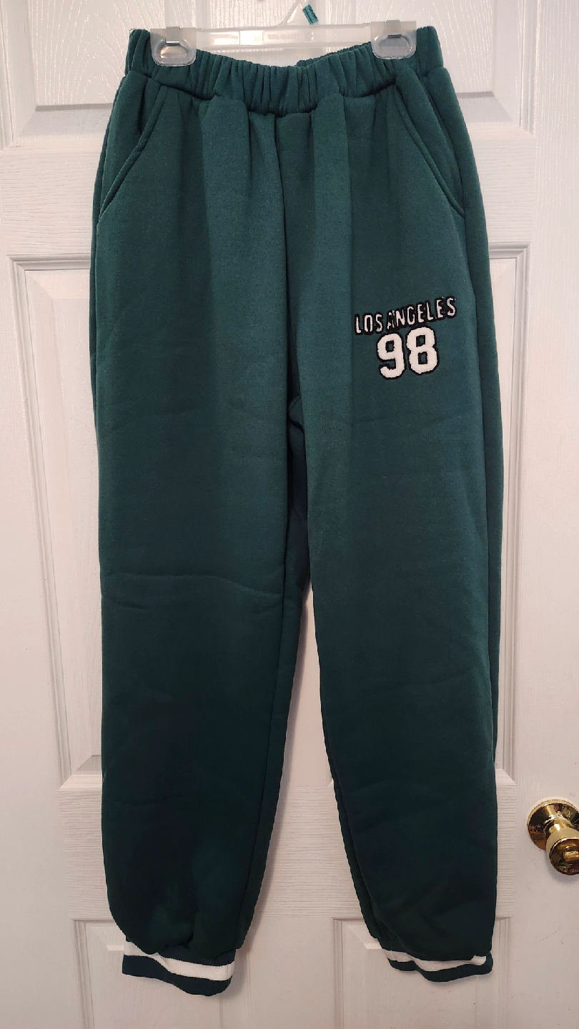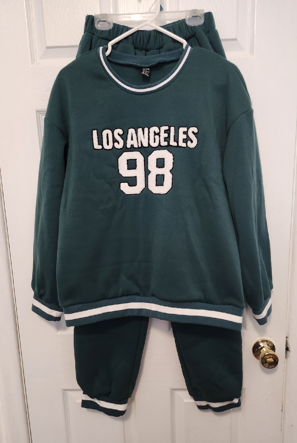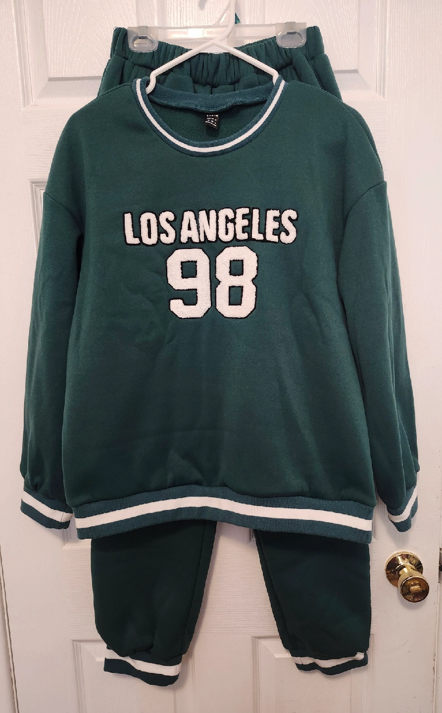 Selling a comfy Shein sweatsuit in a lovely green colour. It features a 'Los Angeles 98' design on both the top and pants. Perfect for lounging or casual outings!