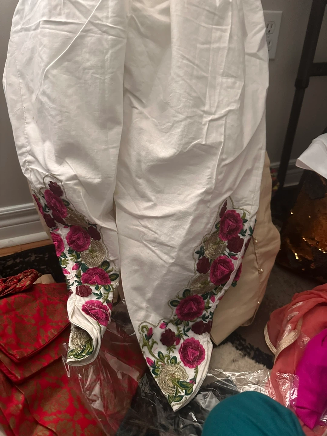 These are white salwar pants with beautiful floral embroidery at the bottom. They're perfect for a traditional look!
