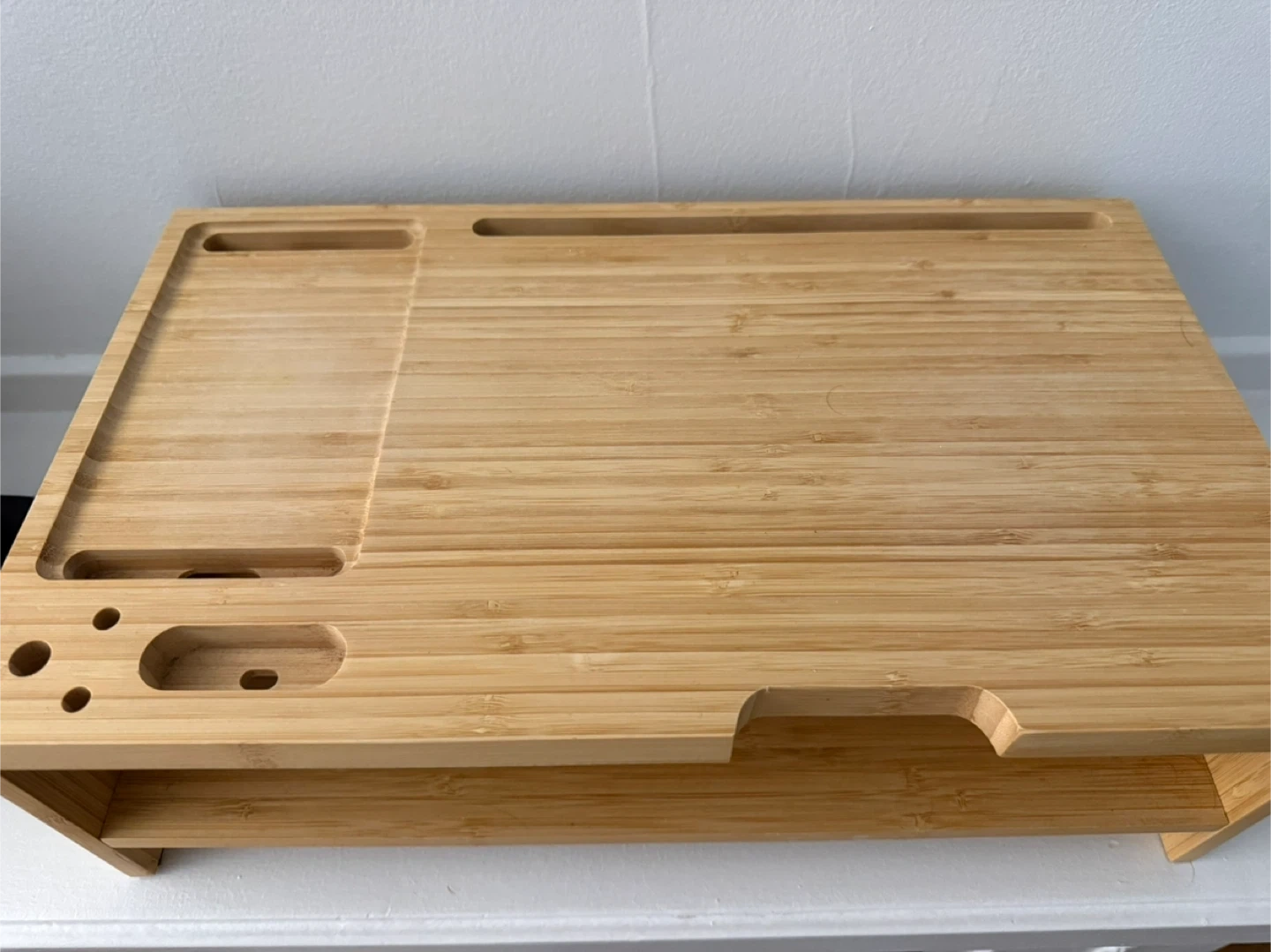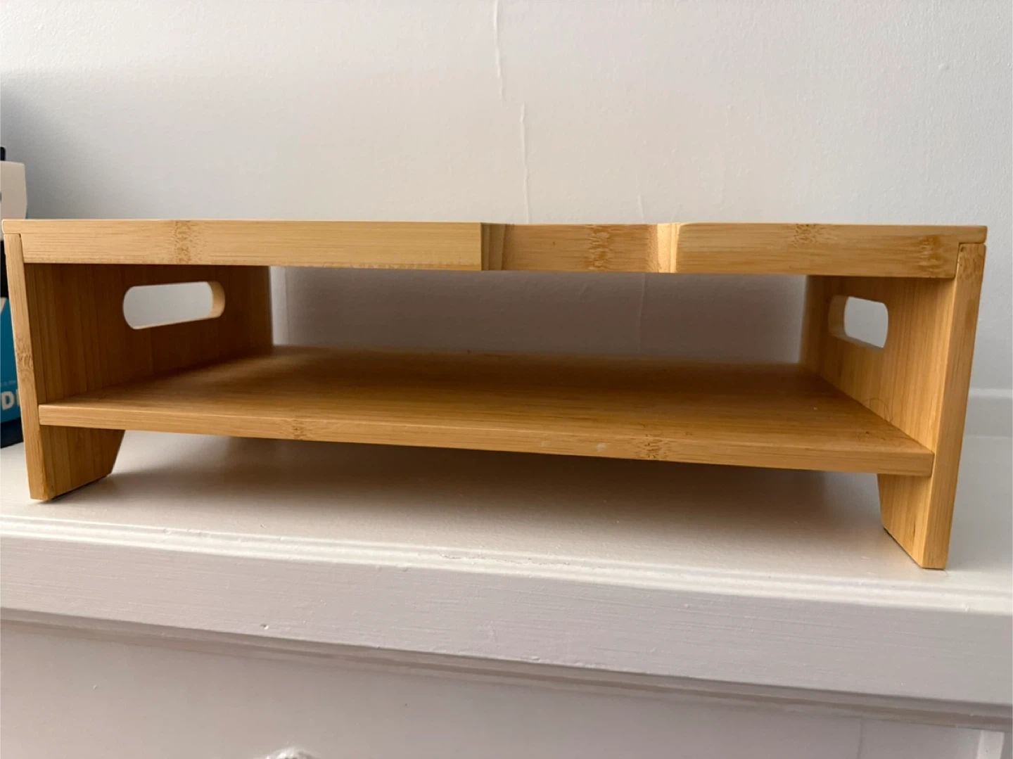 Selling a bamboo monitor stand riser! It's in great condition and perfect for raising your monitor to a more comfortable viewing height. It also has some handy slots for holding pens, phones, and other small items. Great for organizing your desk space