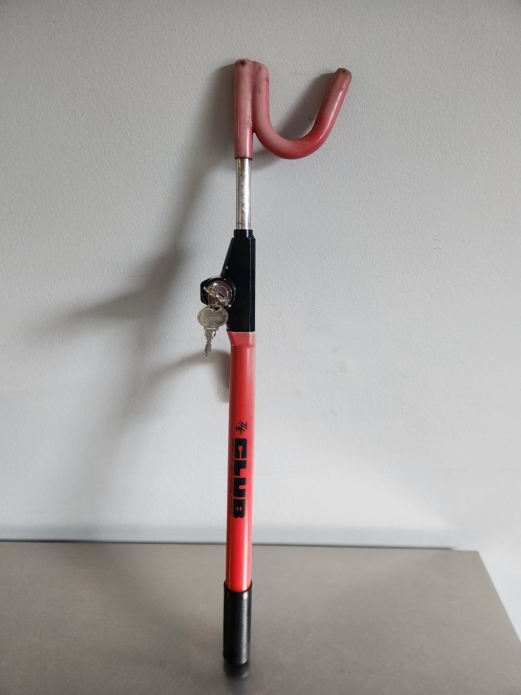 Selling a used steering wheel lock from The Club. It comes with two keys. It's showing some signs of wear but still works great as an anti-theft device!