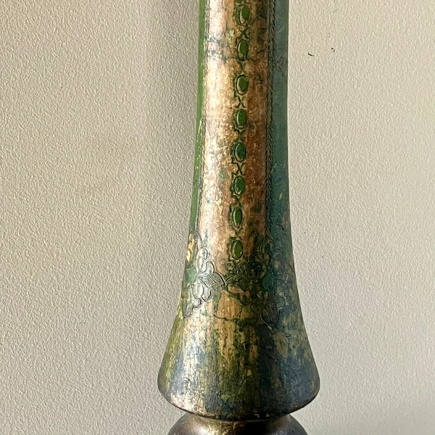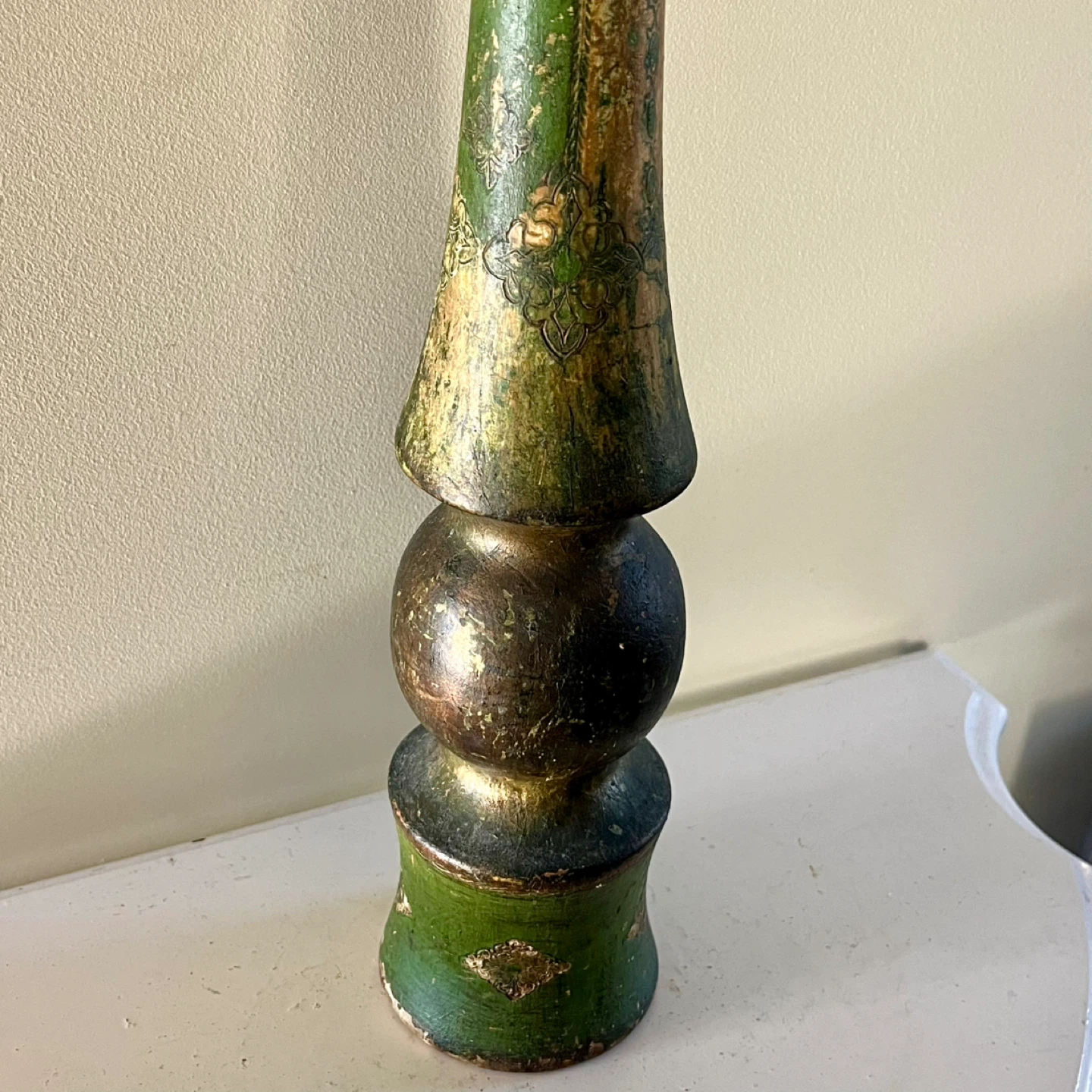 This vintage mid-century hand-painted Firenze pepper grinder is a unique addition to any kitchen or collection, standing approximately 21 inches tall. Its distinctive design and vibrant, hand-painted details make it a standout piece. This item is in used condition, showing some wear consistent with its age, which only adds to its vintage charm.