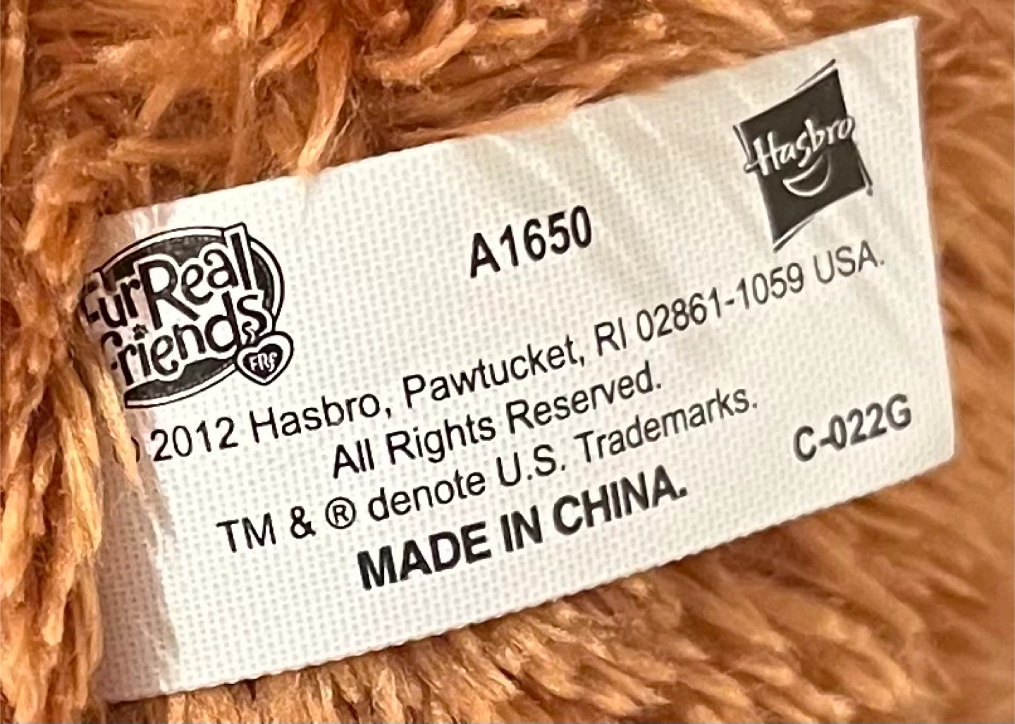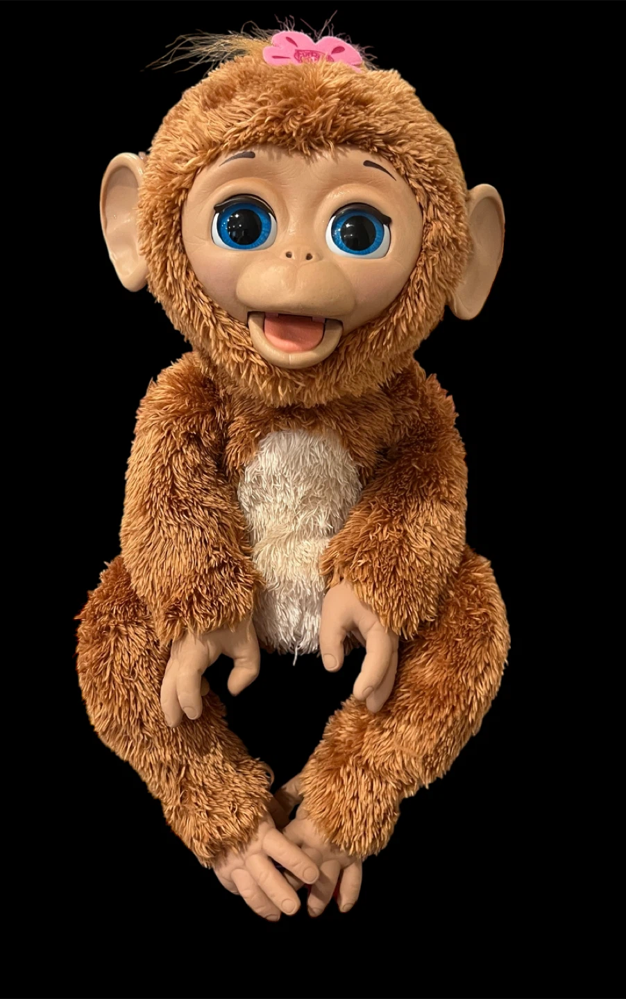 This is a FurReal Friends interactive vintage monkey toy! It's in good condition and ready for a new home. It has a cute pink flower on its head with the FurReal Friends logo. The monkey is brown with blue eyes and a white belly. It's a fun and engaging toy for kids