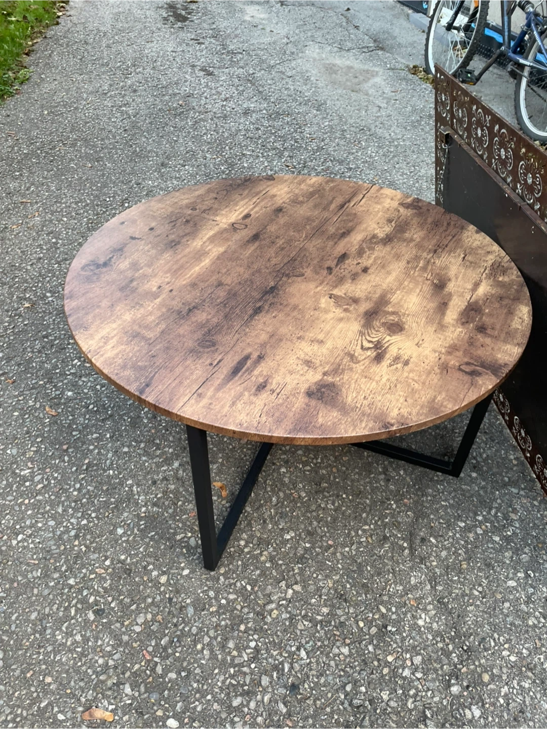 Selling a round coffee table with a wood-look top and black metal legs. It's in great shape and would look lovely in any living room!