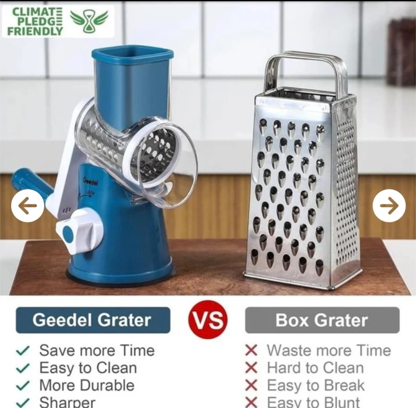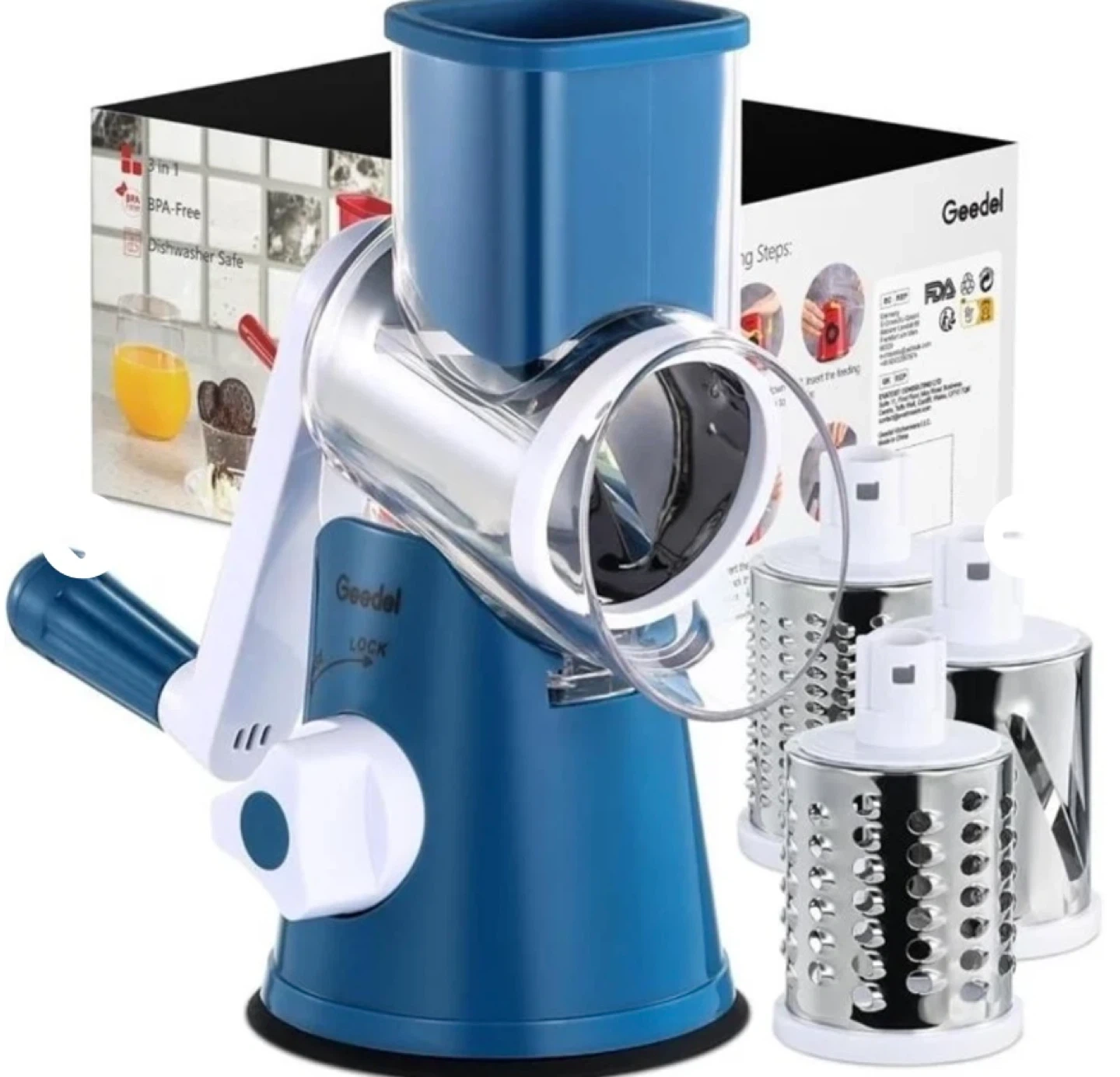 44I'm selling a brand new Geedel rotary drum grater, still in its original box! It's a 3-in-1 grater that's BPA-free and dishwasher safe. The box includes the user manual and all the accessories. It's designed to save you time, is easy to clean, more durable, and sharper than a traditional box grater. It's climate pledge friendly too!
