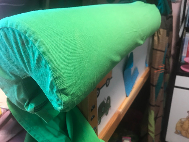 This green IKEA headrest is designed for a loft bed and is in good, used condition. It provides a comfortable and safe place to rest your head while in bed. Perfect for adding a touch of coziness and safety to your kid's sleep space! If this ad is still up, then it's still available for purchase, so let me know if you're interested!